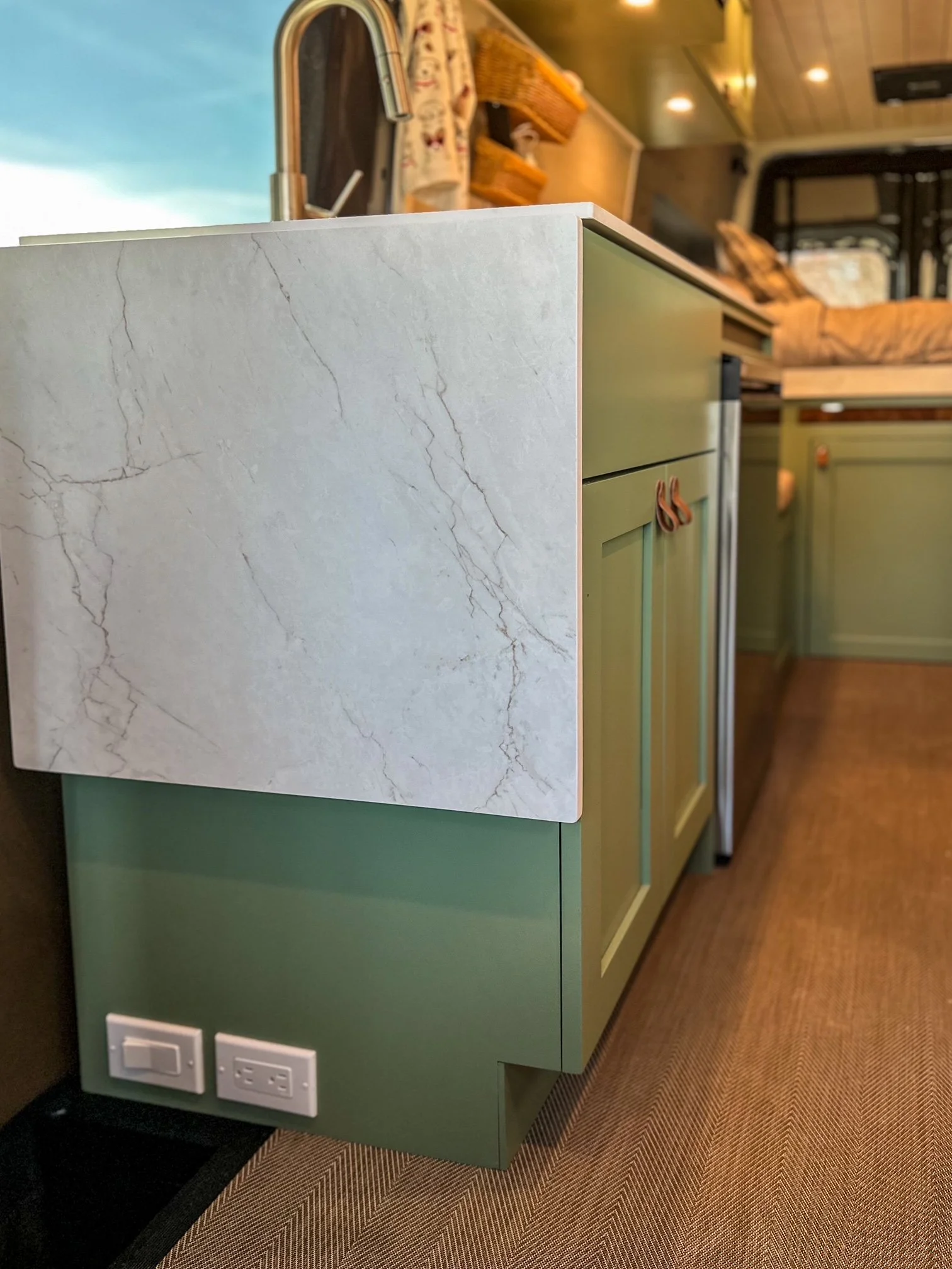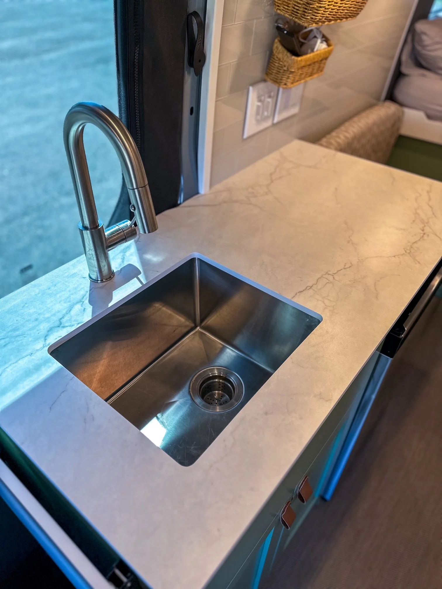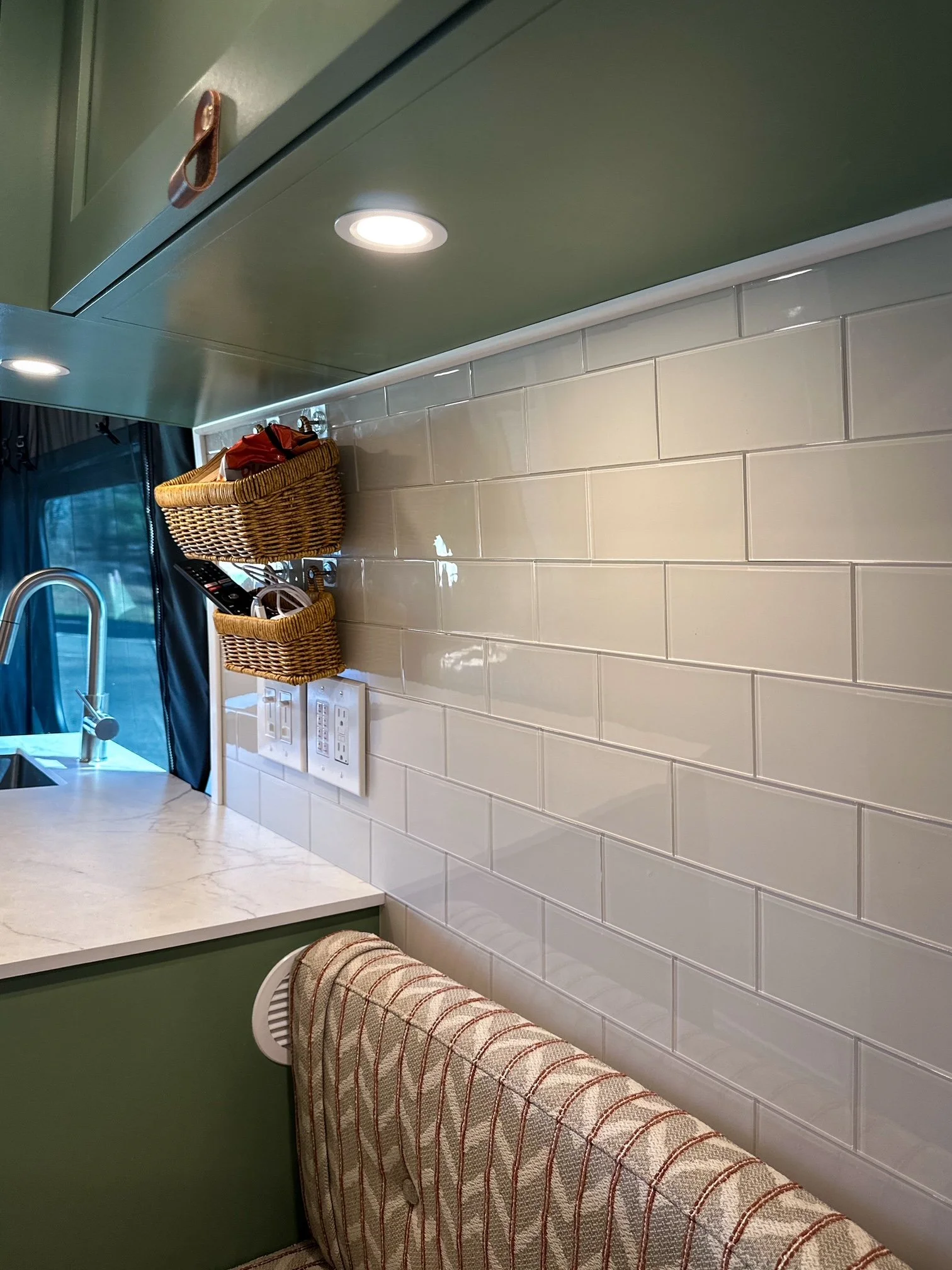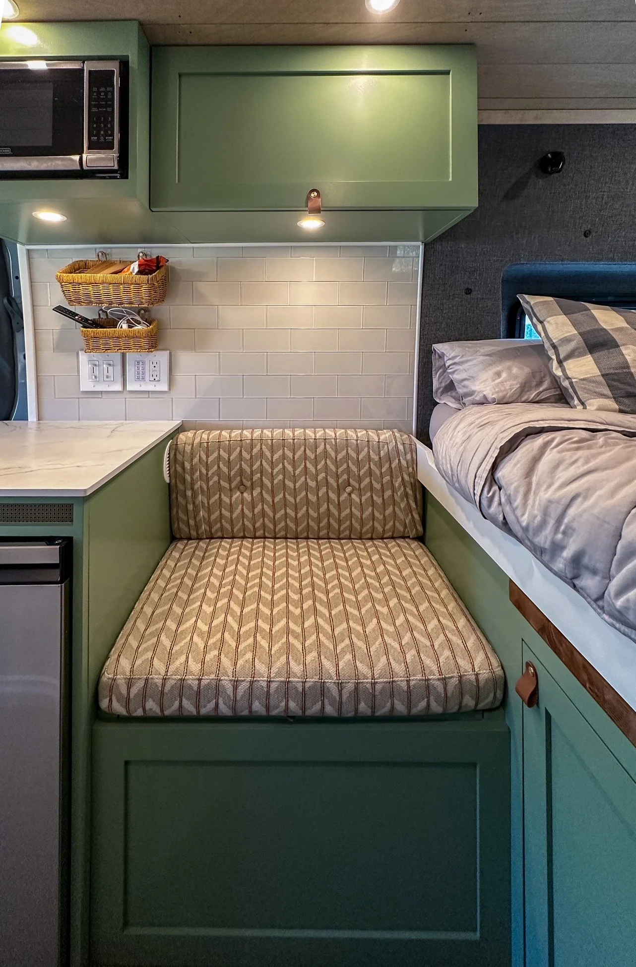 Angela’s interior features upholstered wall panels and Flarespace flares, providing extra room to sleep sideways and adding a layer of quiet insulation. The full-size indoor shower makes off-grid travel more comfortable, while the custom kitchen cabinetry, solid countertops, and a striking glass tile backsplash bring a touch of home-style luxury to life on wheels.