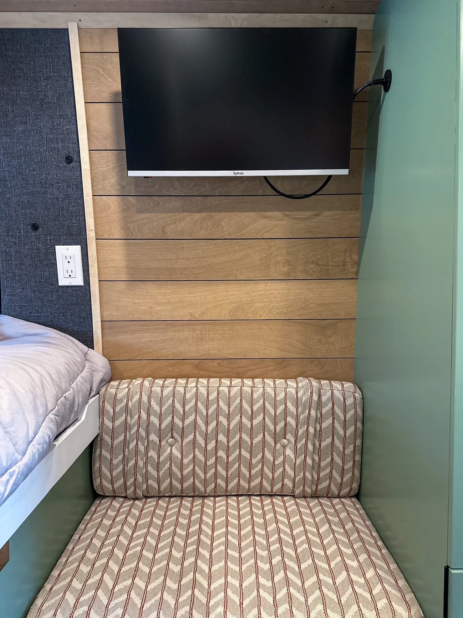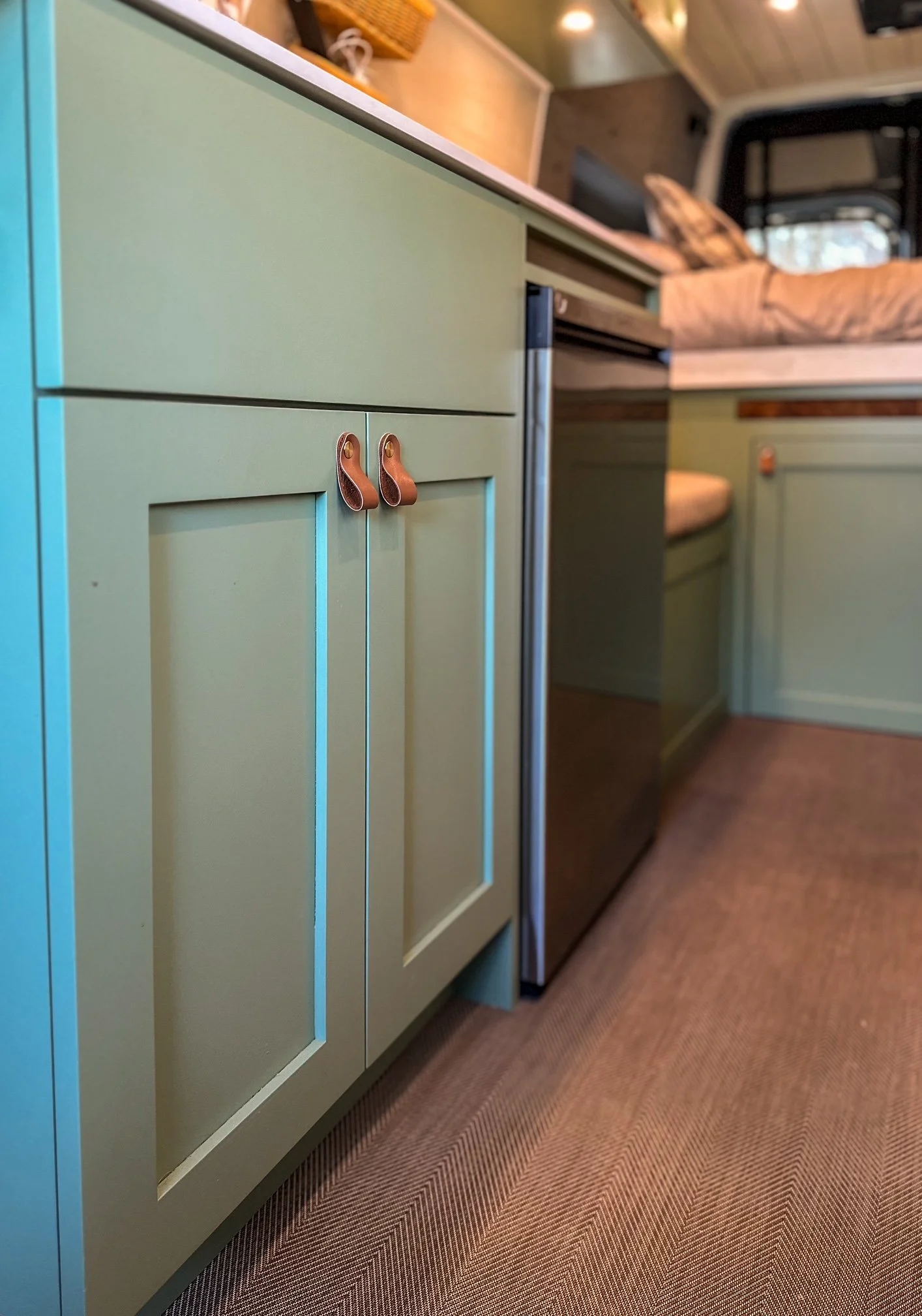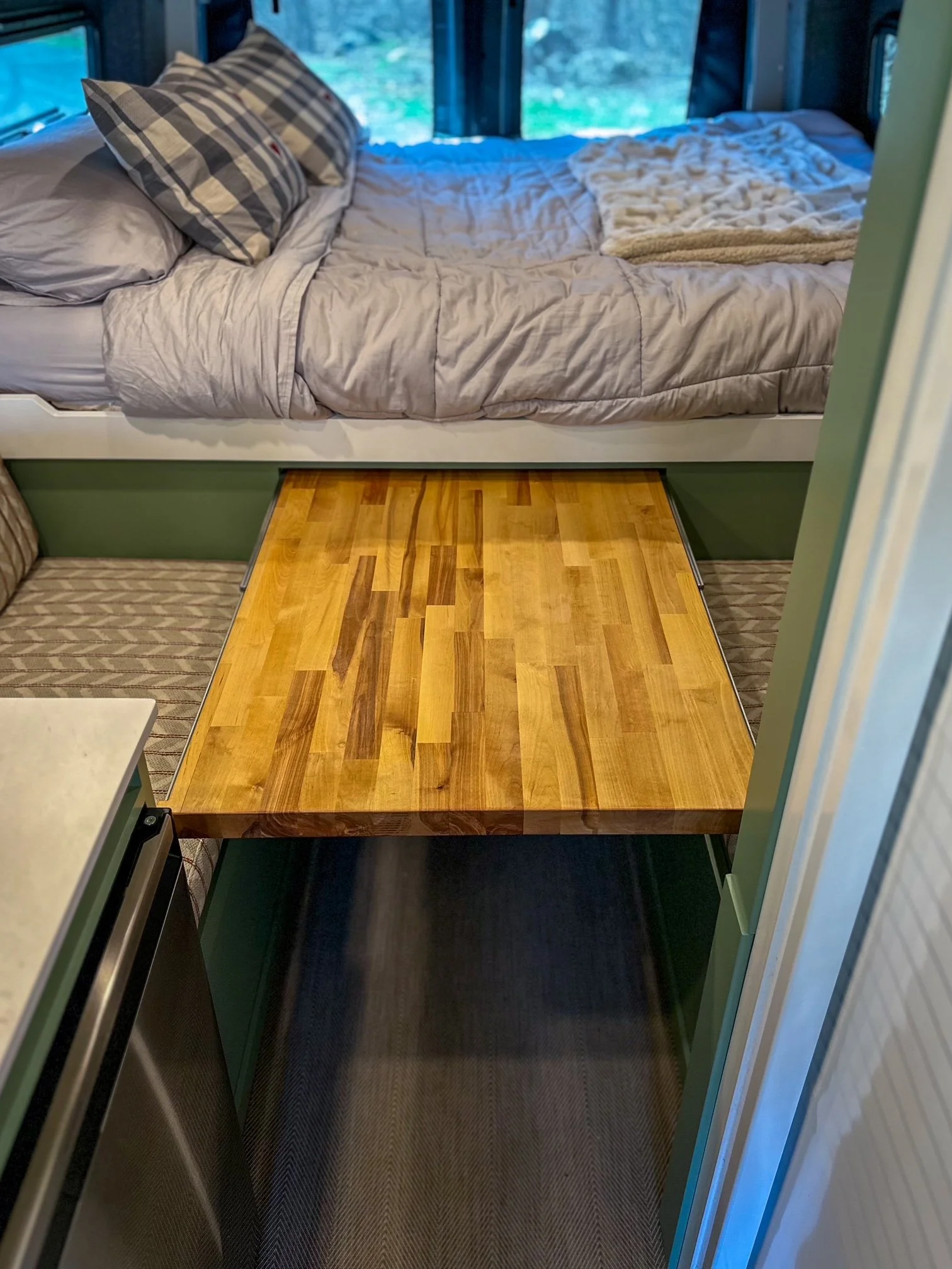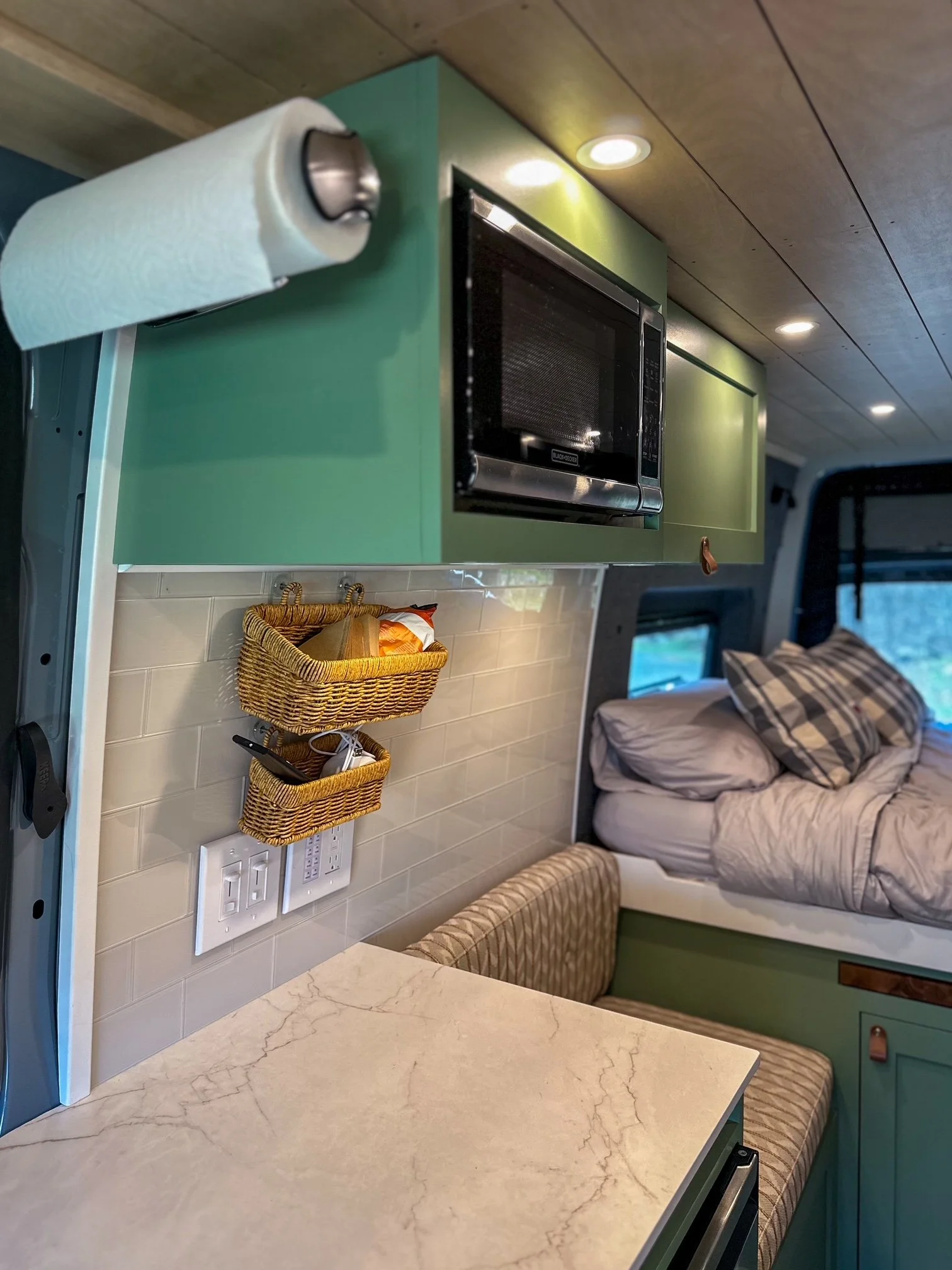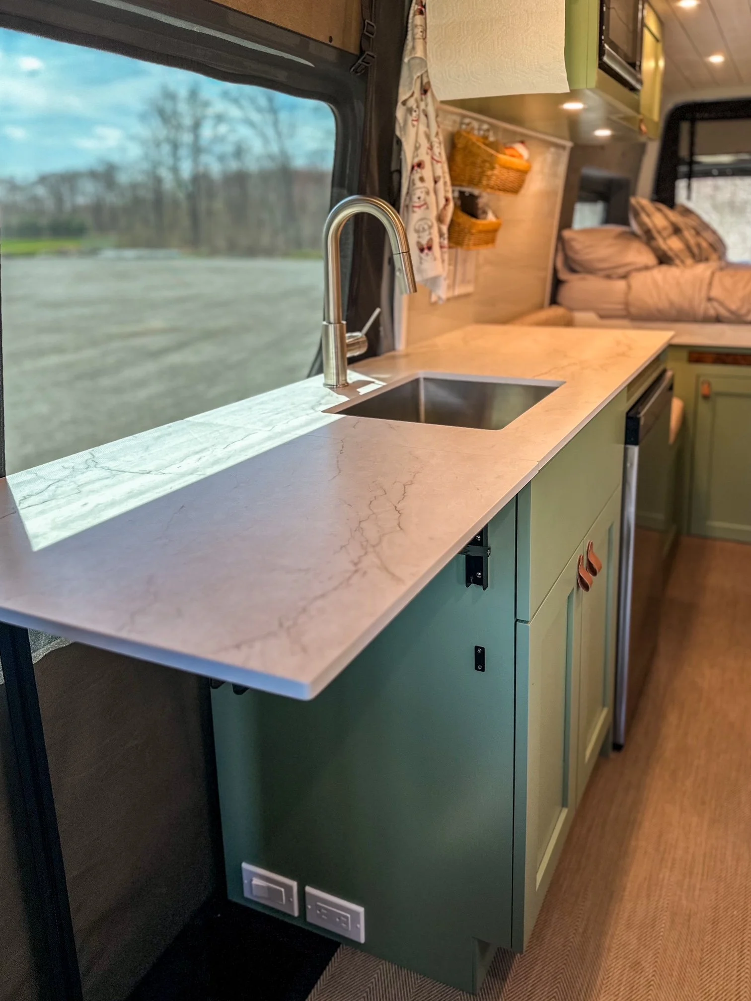Angela’s interior features upholstered wall panels and Flarespace flares, providing extra room to sleep sideways and adding a layer of quiet insulation. The full-size indoor shower makes off-grid travel more comfortable, while the custom kitchen cabinetry, solid countertops, and a striking glass tile backsplash bring a touch of home-style luxury to life on wheels.