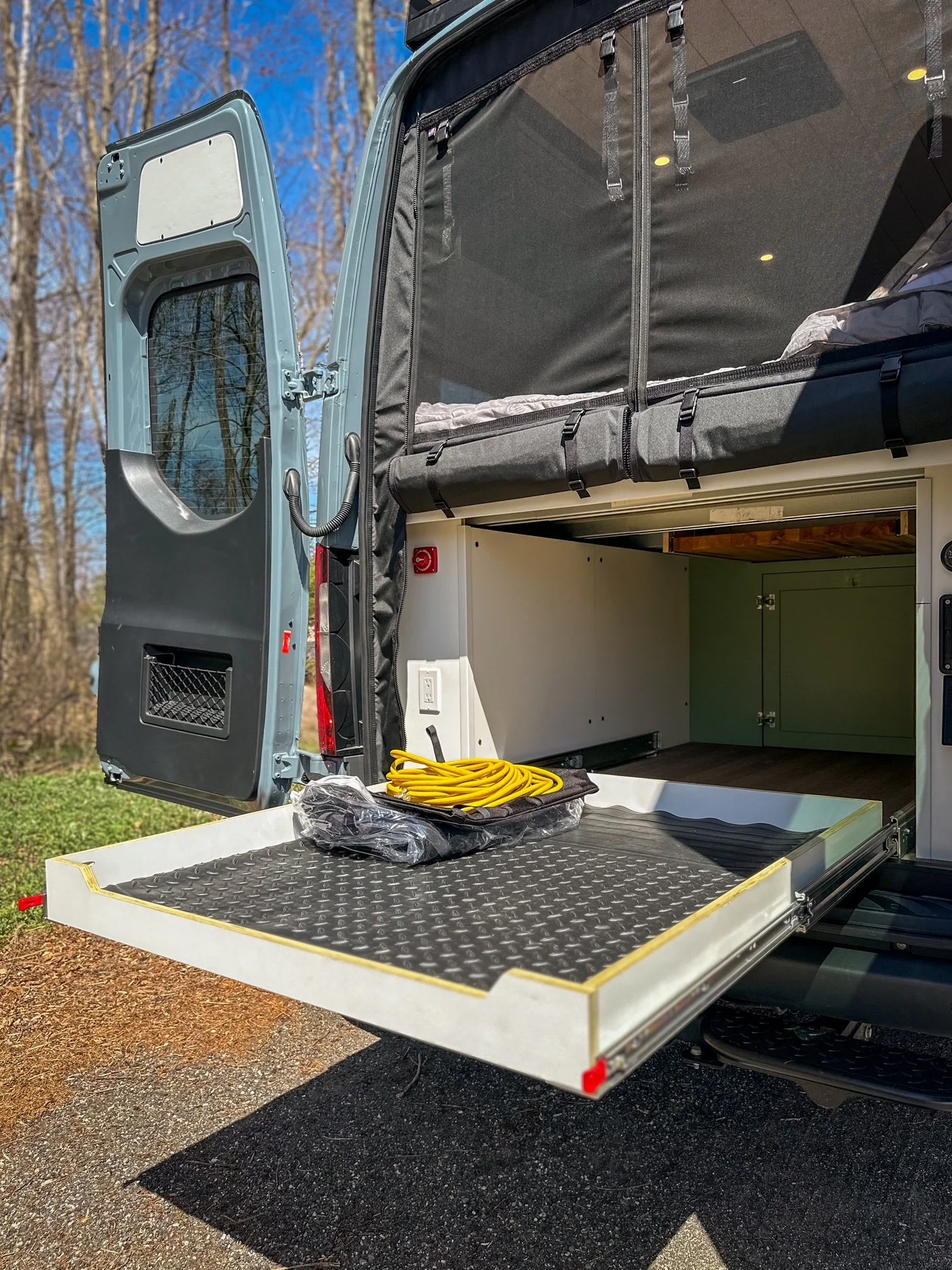 In the garage, a large pull-out storage tray keeps gear organized and accessible, making it easy to load and unload wherever the road takes you.