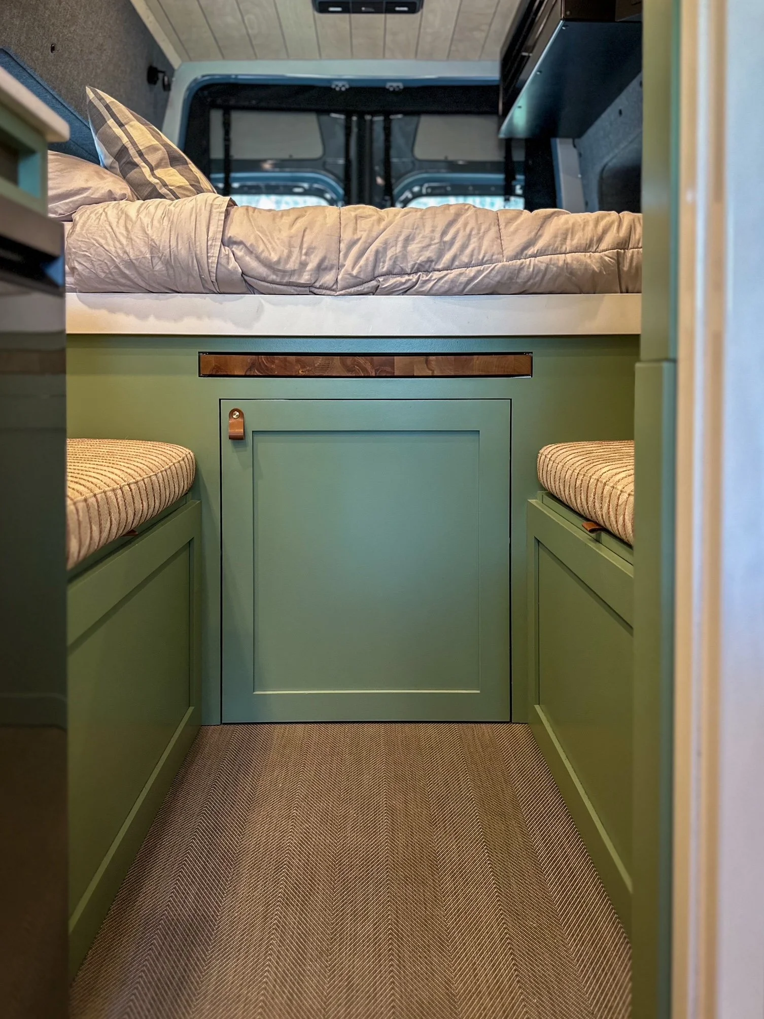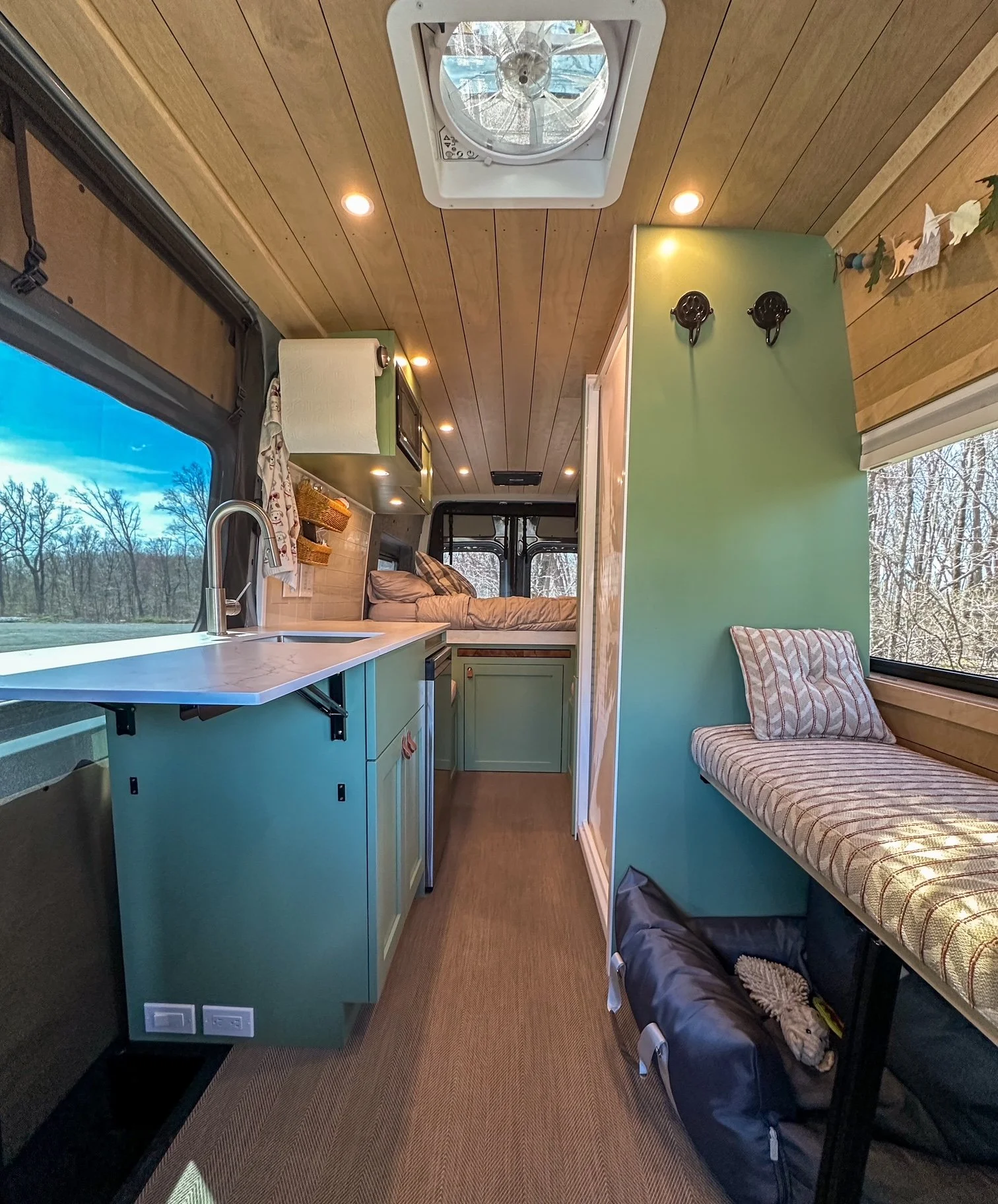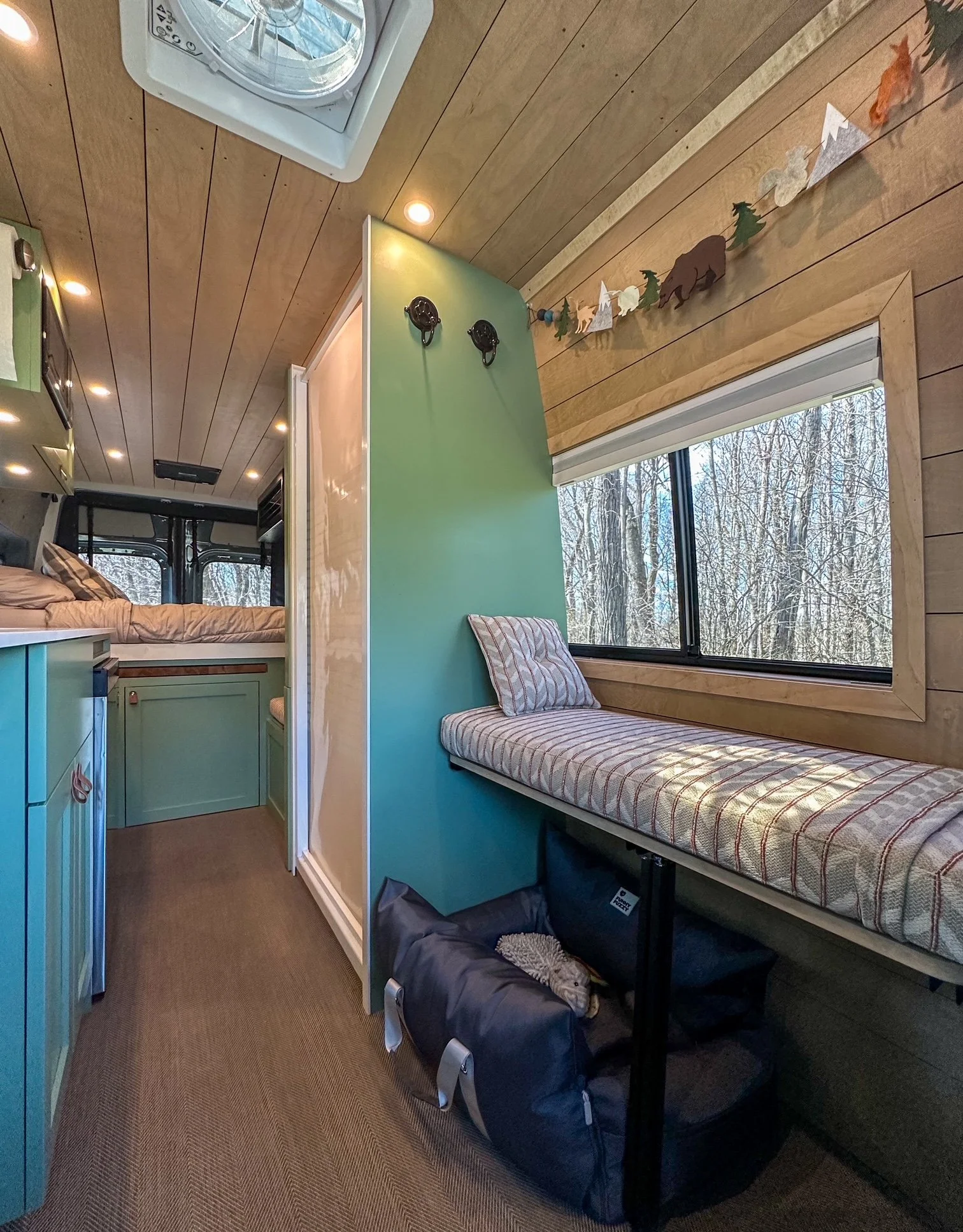 This build was designed from the ground up to support travel with dogs, with durable materials, open floor space, and layout choices that prioritize ease and comfort for both people and pups. Whether parked trailside or heading cross-country, Angela is ready for the ride.