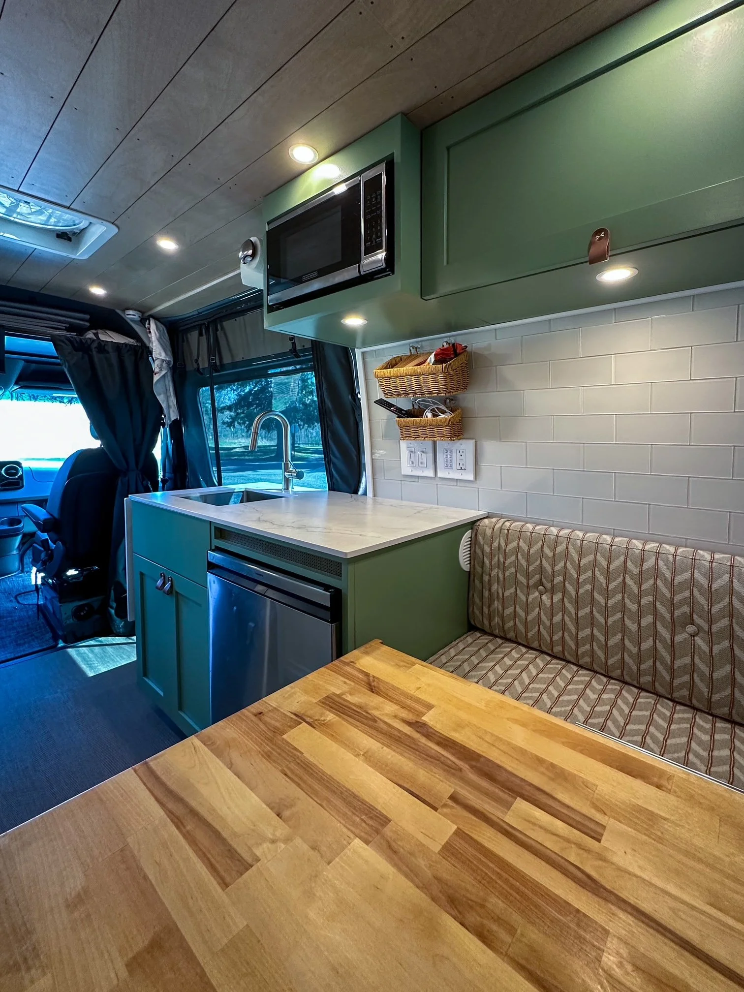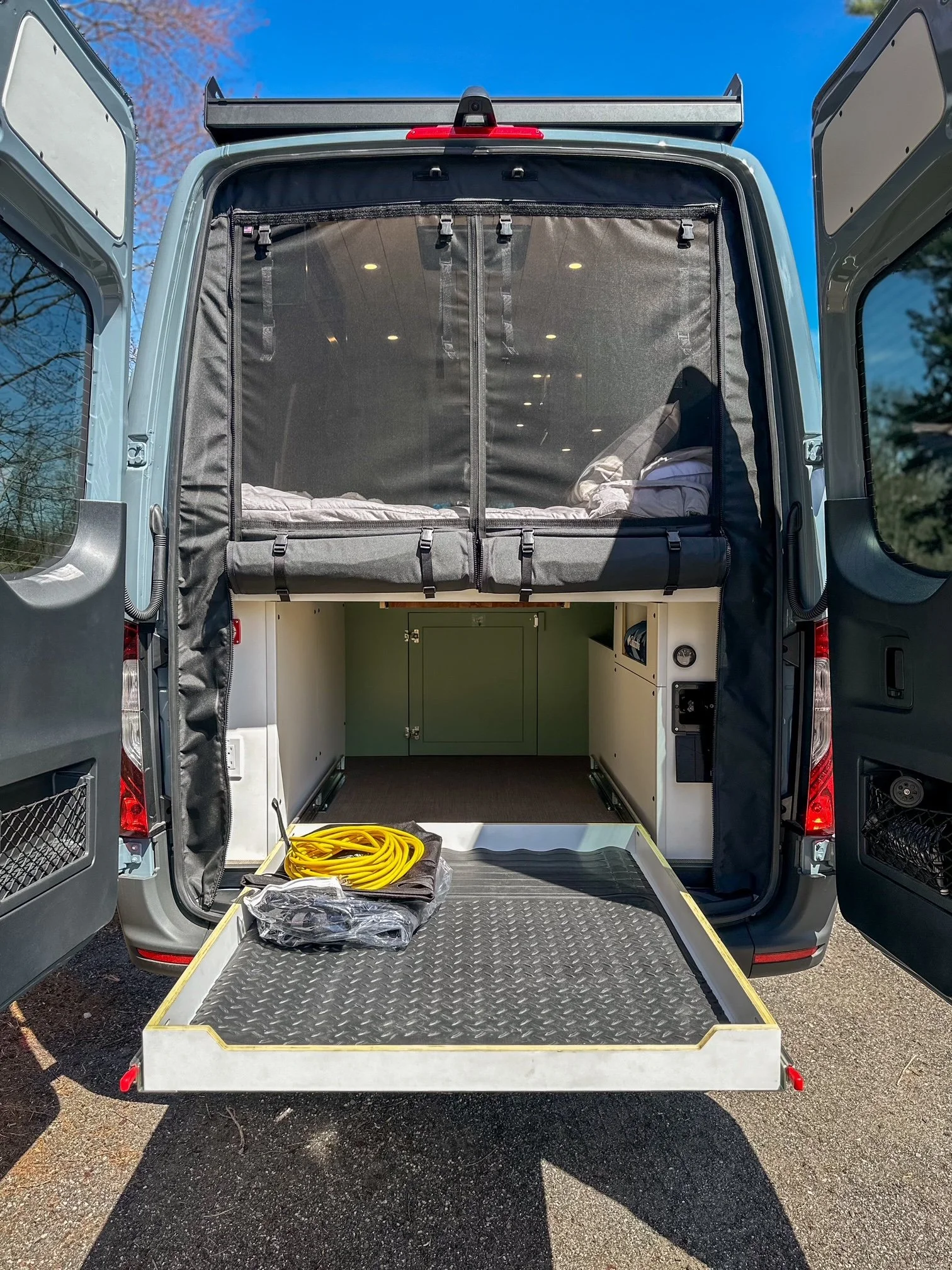 Angela was thoughtfully designed for comfort and life on the road with four-legged companions. Every detail of this build balances functionality and style, with custom features that make van life feel like home.