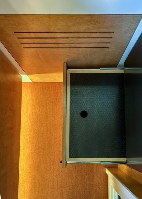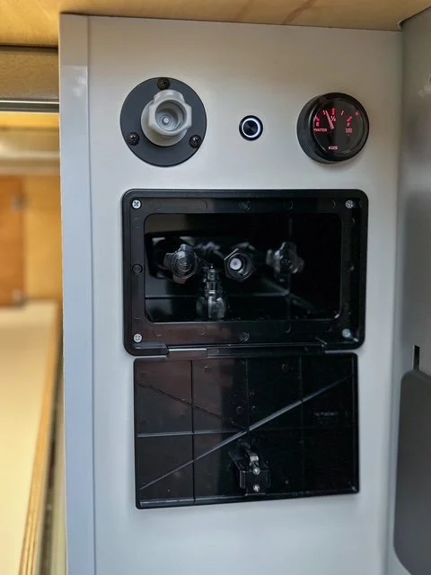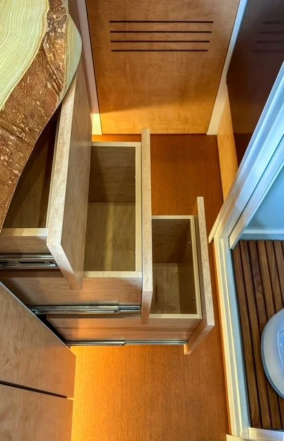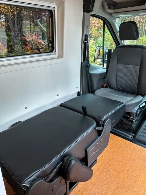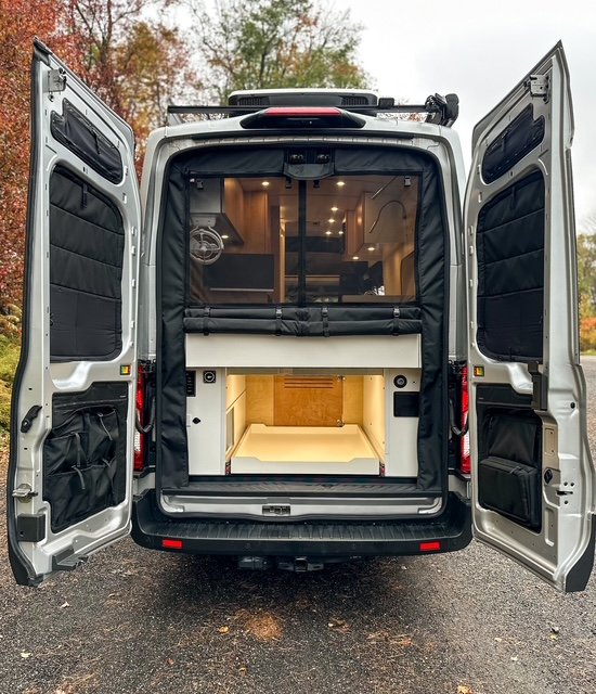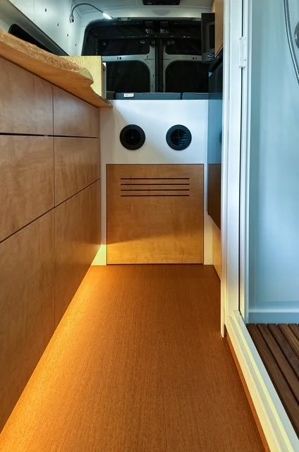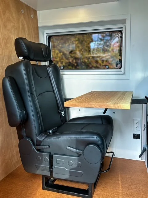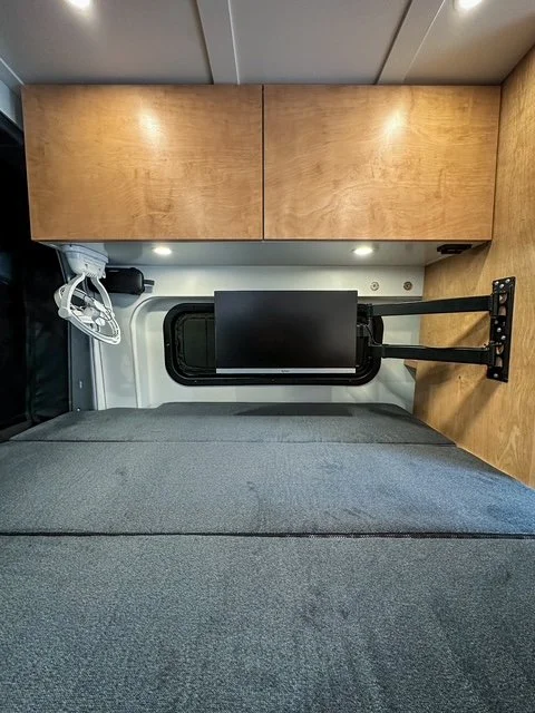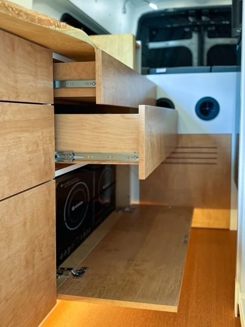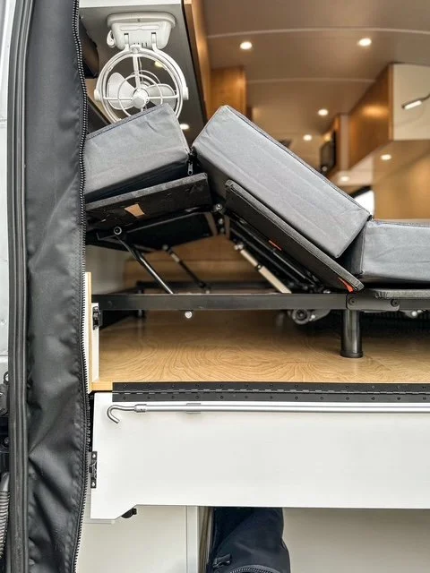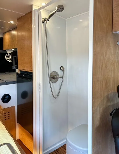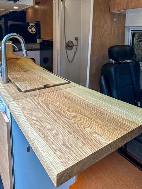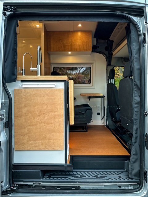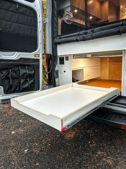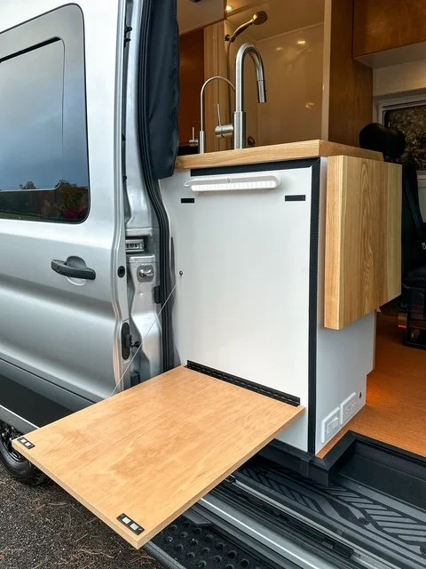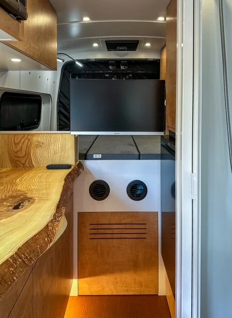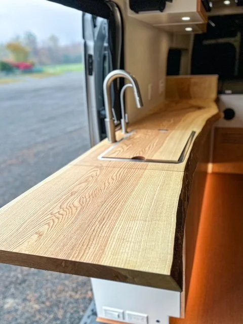 Charlie is a sleek, extended‑wheelbase van conversion crafted for both comfort and functionality. The interior is anchored by beautiful Birch wood cabinetry and a striking live edge wood slab, which serves as the heart and soul of the van. The rich wood grain extends the full length of the kitchen and flows over the waterfall edge, showcasing depth, character, and artisanal craftsmanship.