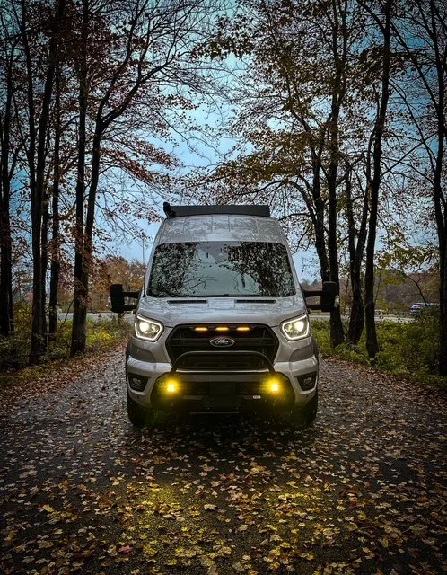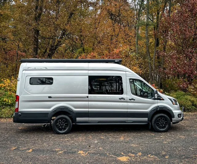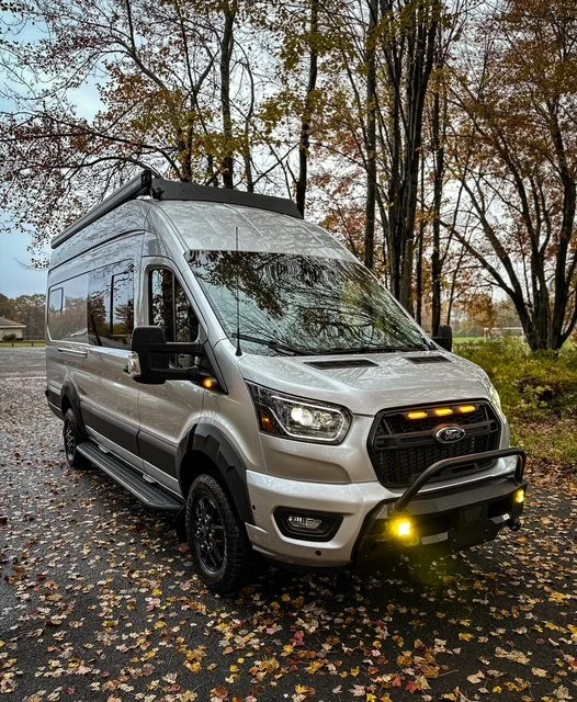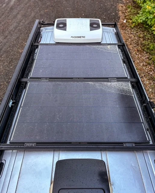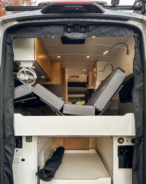 On the exterior, Charlie is built to handle the road less traveled, featuring a Flatline Van Co. front bumper with Baja Designs lighting, a side ladder, roof rack with 400 watts of solar, and protective wheel flares. The overall aesthetic perfectly balances rugged capability with clean, modern design, creating a van that is as practical as it is inviting.