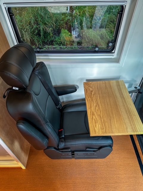 A third passenger seat is thoughtfully integrated alongside a Lagun swivel table, which doubles as an additional sleeping area. The primary sleeping area is arranged east-west, maximizing floor space without sacrificing comfort. The powered, remote-controlled adjustable bed paired with a custom RoamRest mattress ensures the same level of familiar, at-home comfort whether parked or on the road.