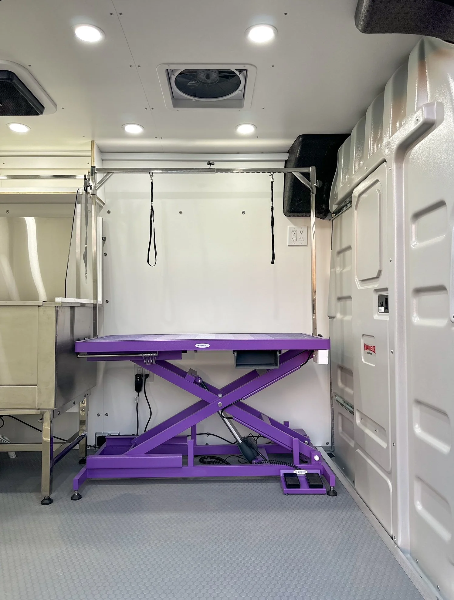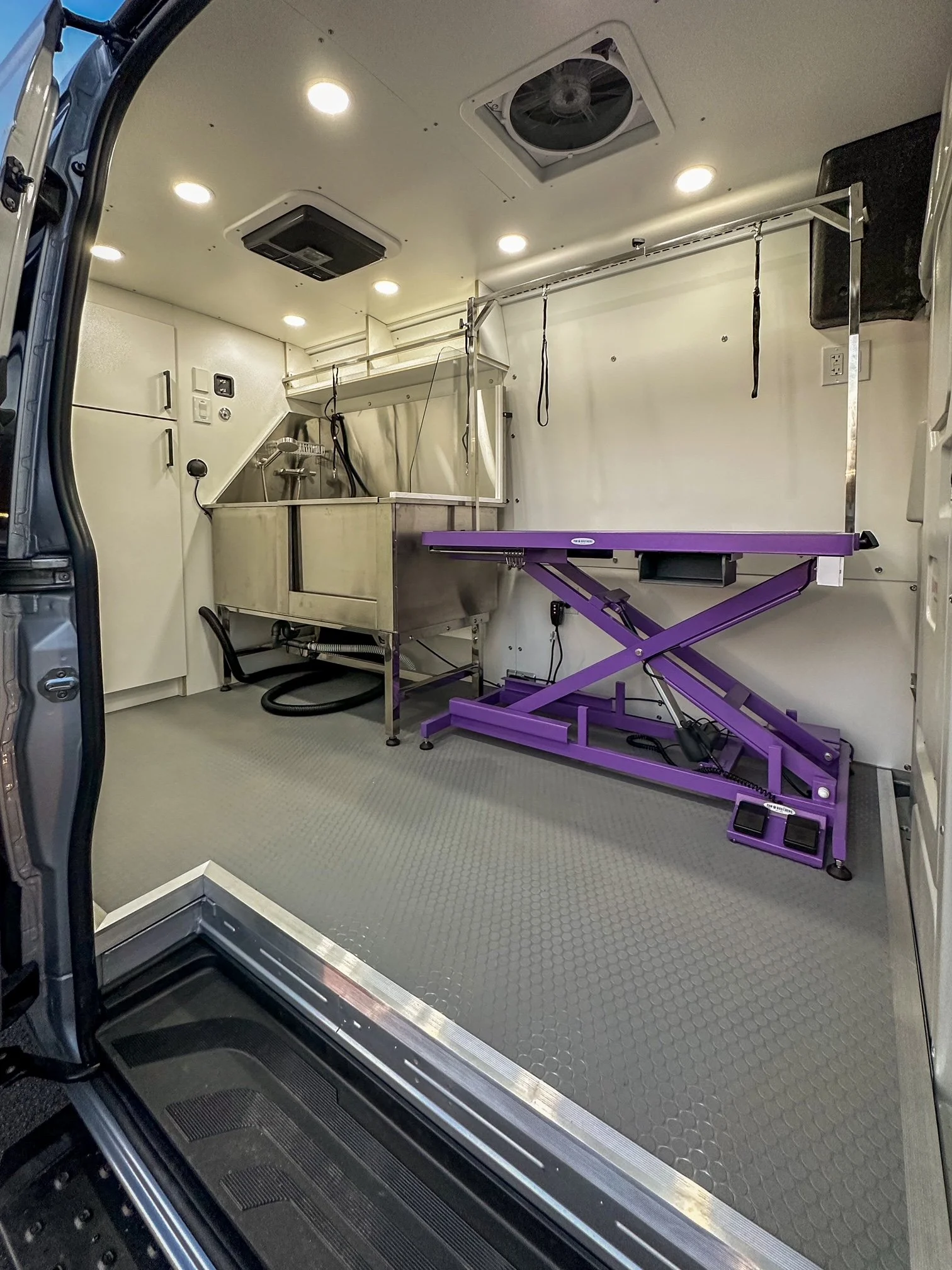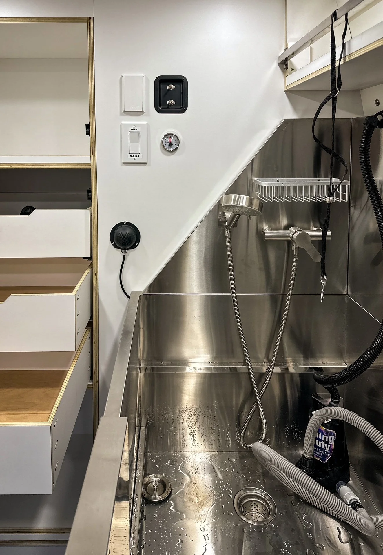 This van was another unique project for us! Our customer came to use looking to build their next mobile dog grooming van. They had spent the past several years operating from a Sprinter 144” that has been outfitted by a company specializing in dog grooming vans. They came to us with a thorough understanding of what worked well and what didn’t work well for them.