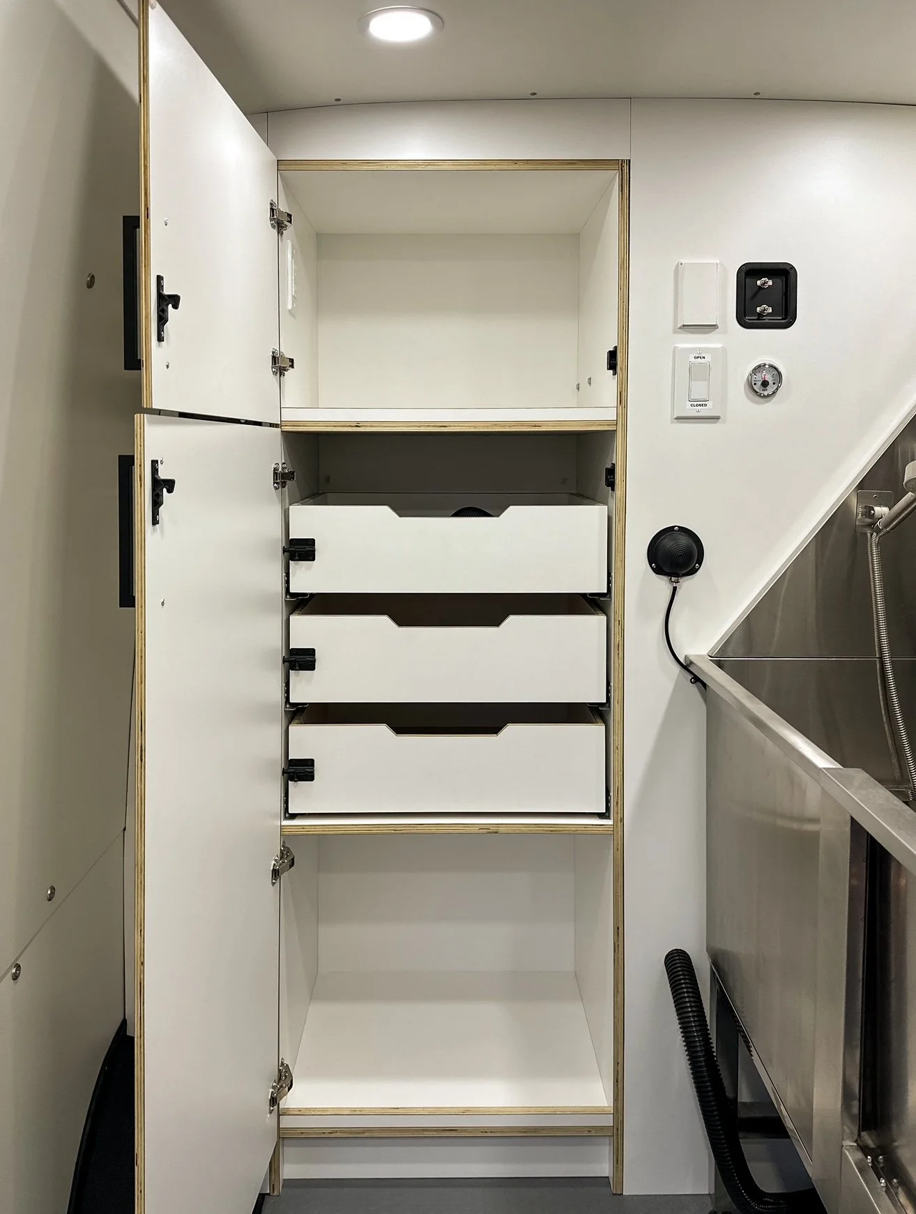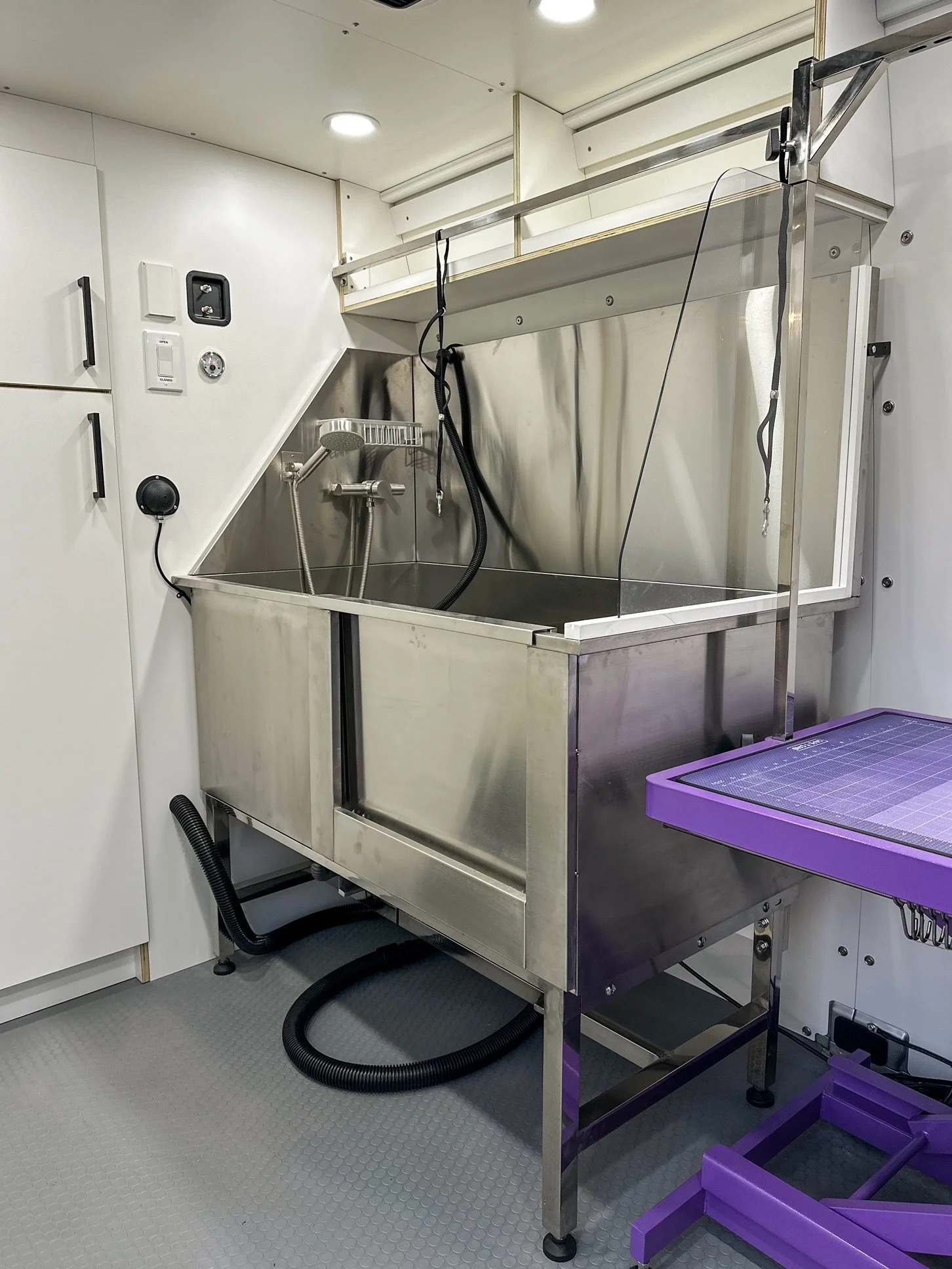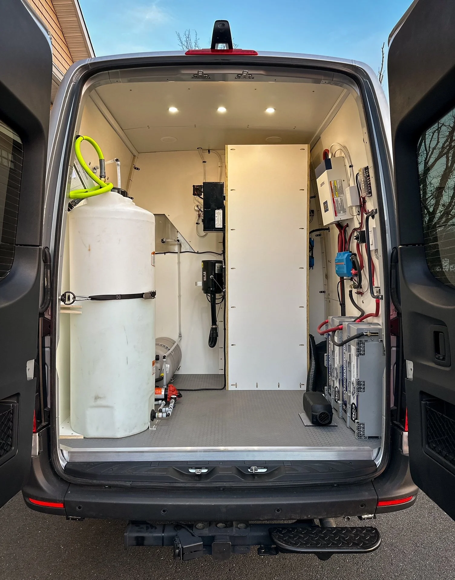 This van was another unique project for us! Our customer came to use looking to build their next mobile dog grooming van. They had spent the past several years operating from a Sprinter 144” that has been outfitted by a company specializing in dog grooming vans. They came to us with a thorough understanding of what worked well and what didn’t work well for them.