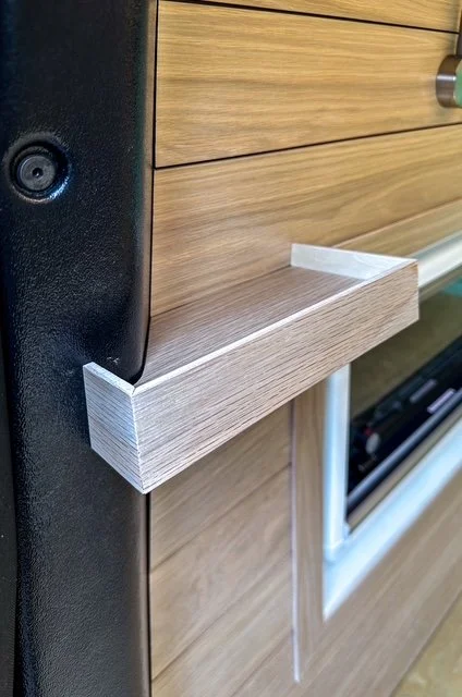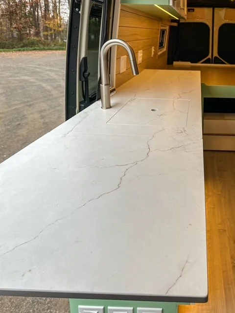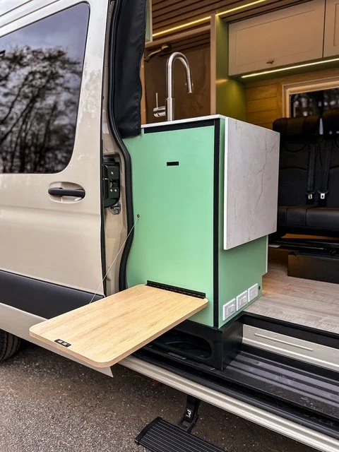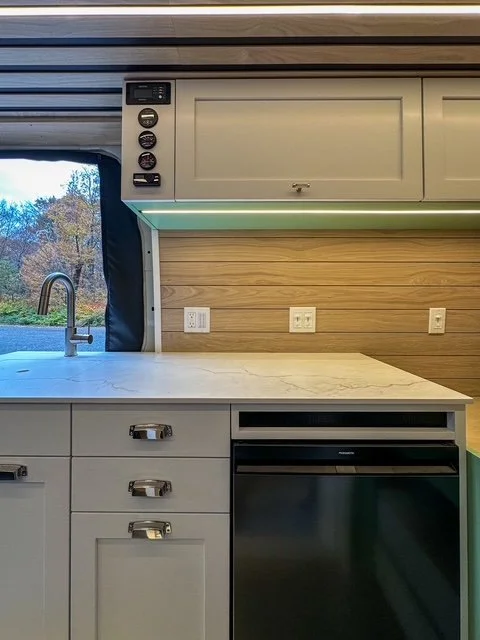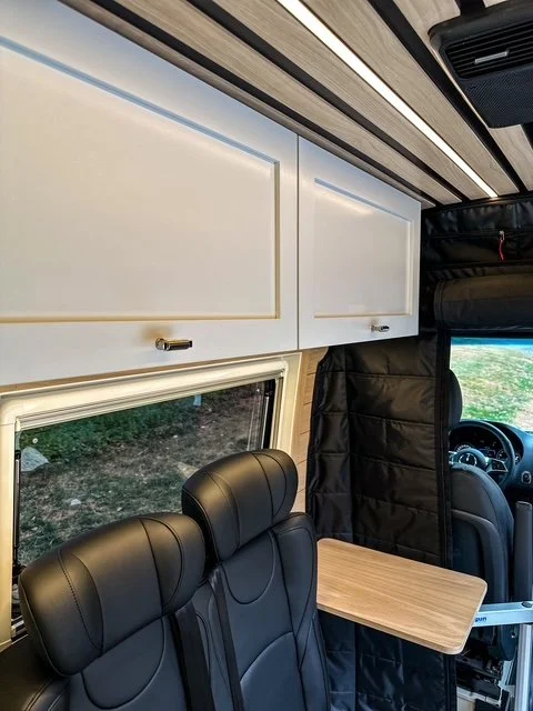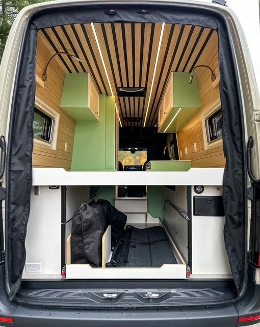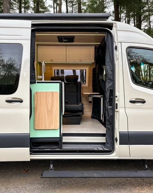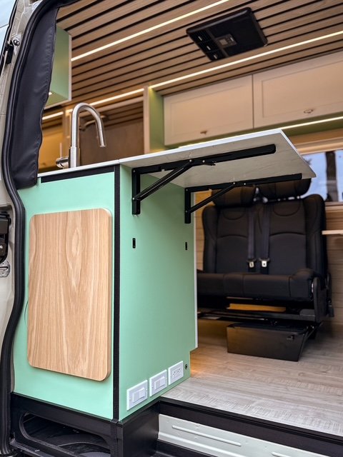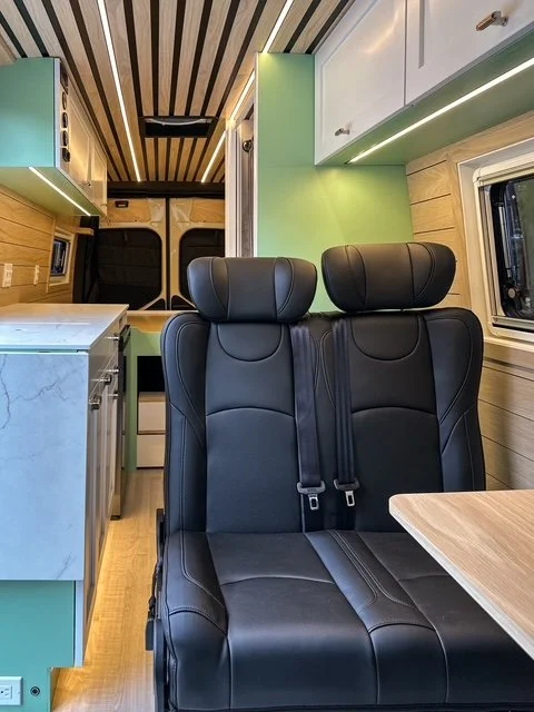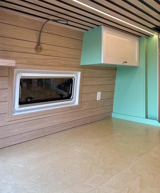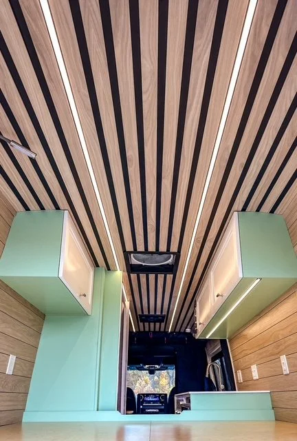 Karen & Howard’s van is a bright, welcoming build crafted with simplicity, comfort, and modern functionality at its core. The interior showcases light-toned cabinetry paired with warm wood wall panels, adding both texture and depth to the living space. Overhead, a striking LED strip–lit ceiling washes the cabin in a soft, ambient glow, creating a refined and contemporary atmosphere throughout.
