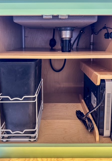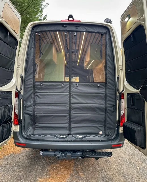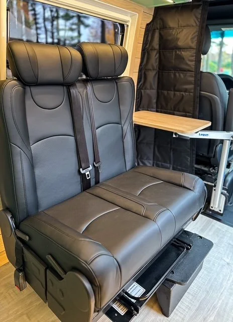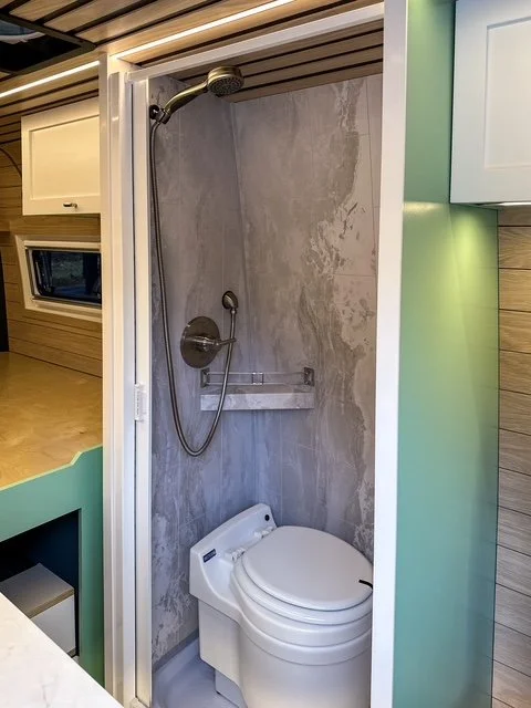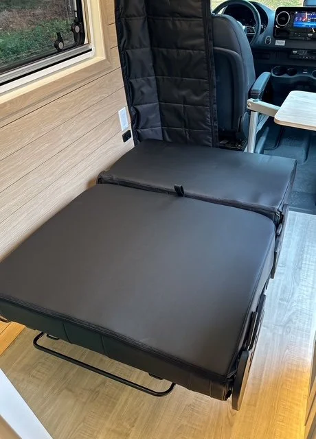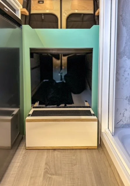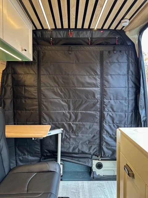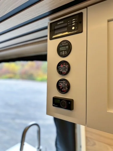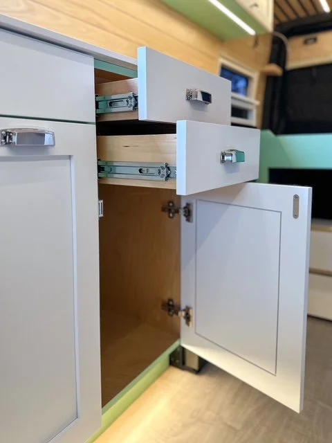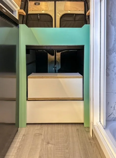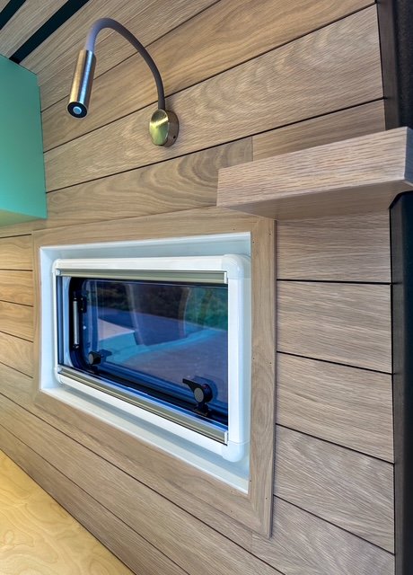 Karen & Howard’s van is a bright, welcoming build crafted with simplicity, comfort, and modern functionality at its core. The interior showcases light-toned cabinetry paired with warm wood wall panels, adding both texture and depth to the living space. Overhead, a striking LED strip–lit ceiling washes the cabin in a soft, ambient glow, creating a refined and contemporary atmosphere throughout.