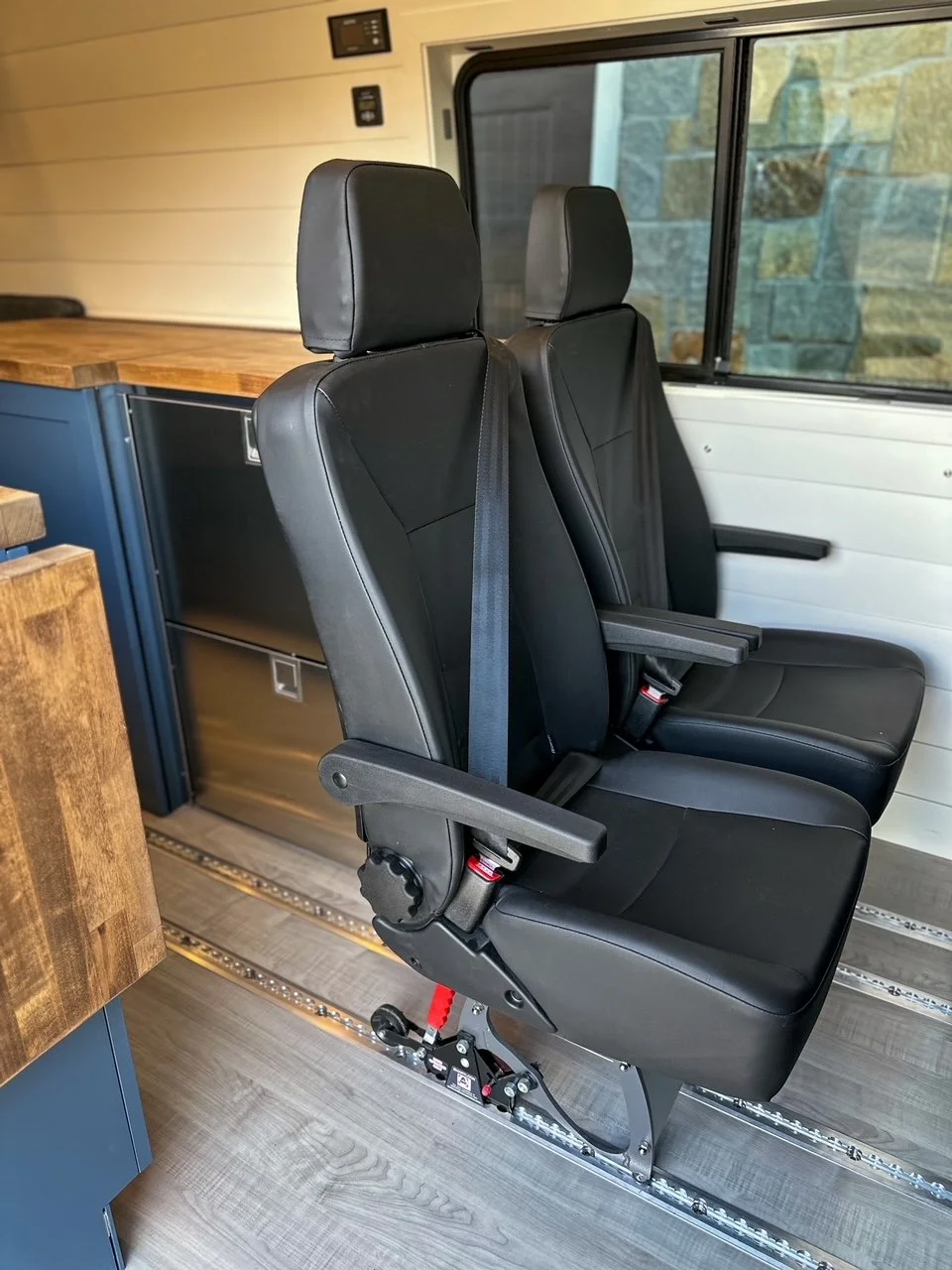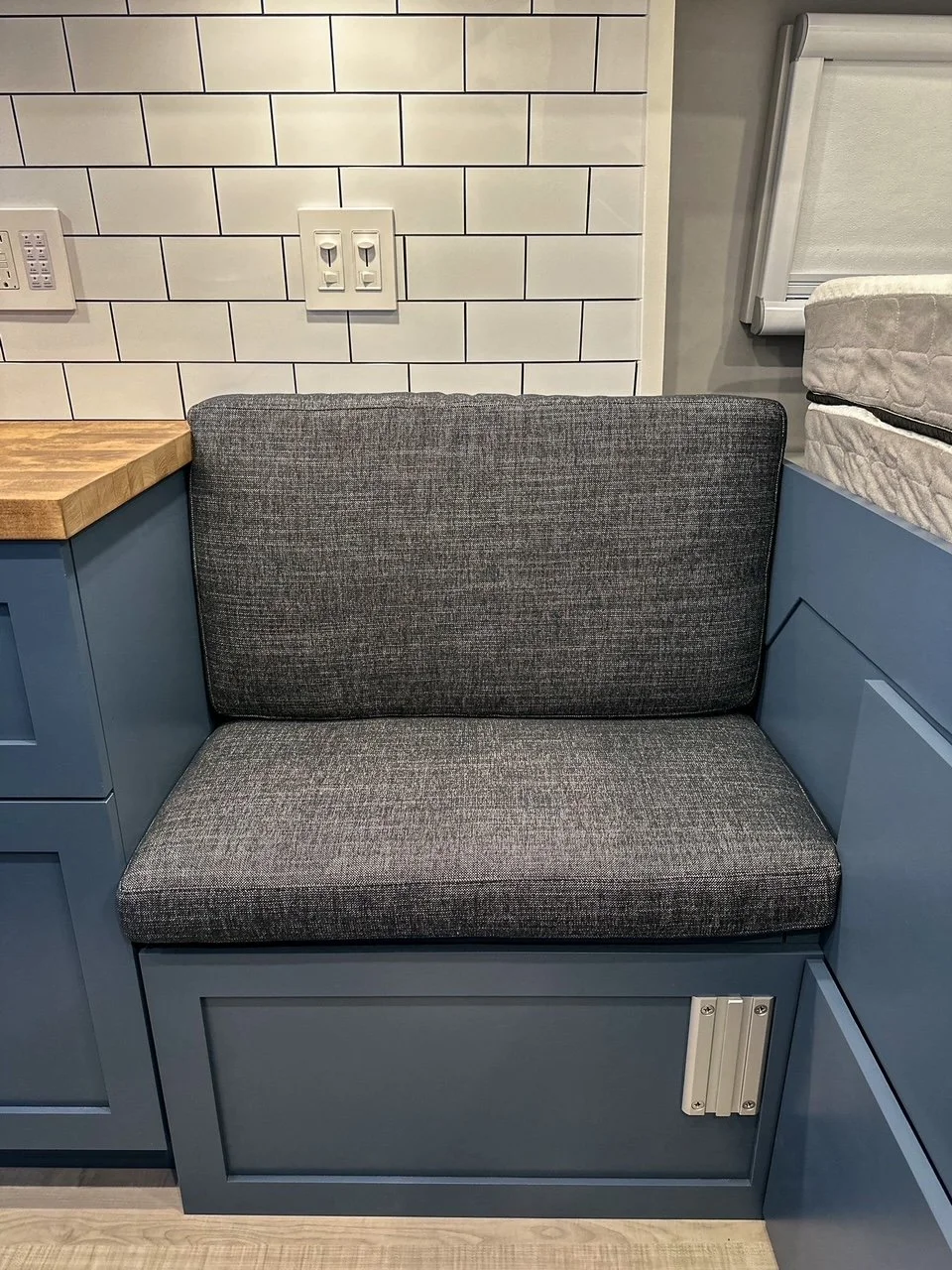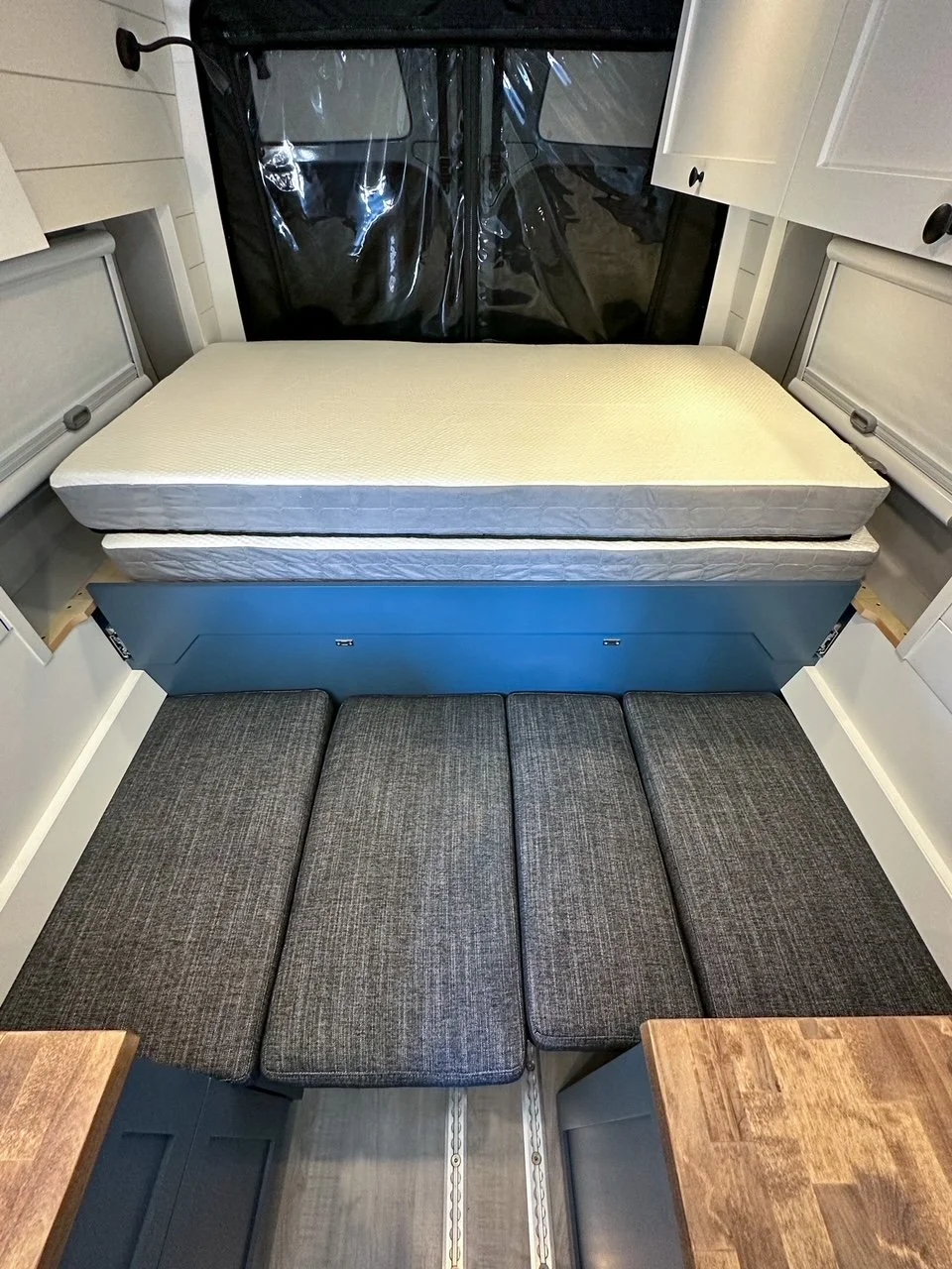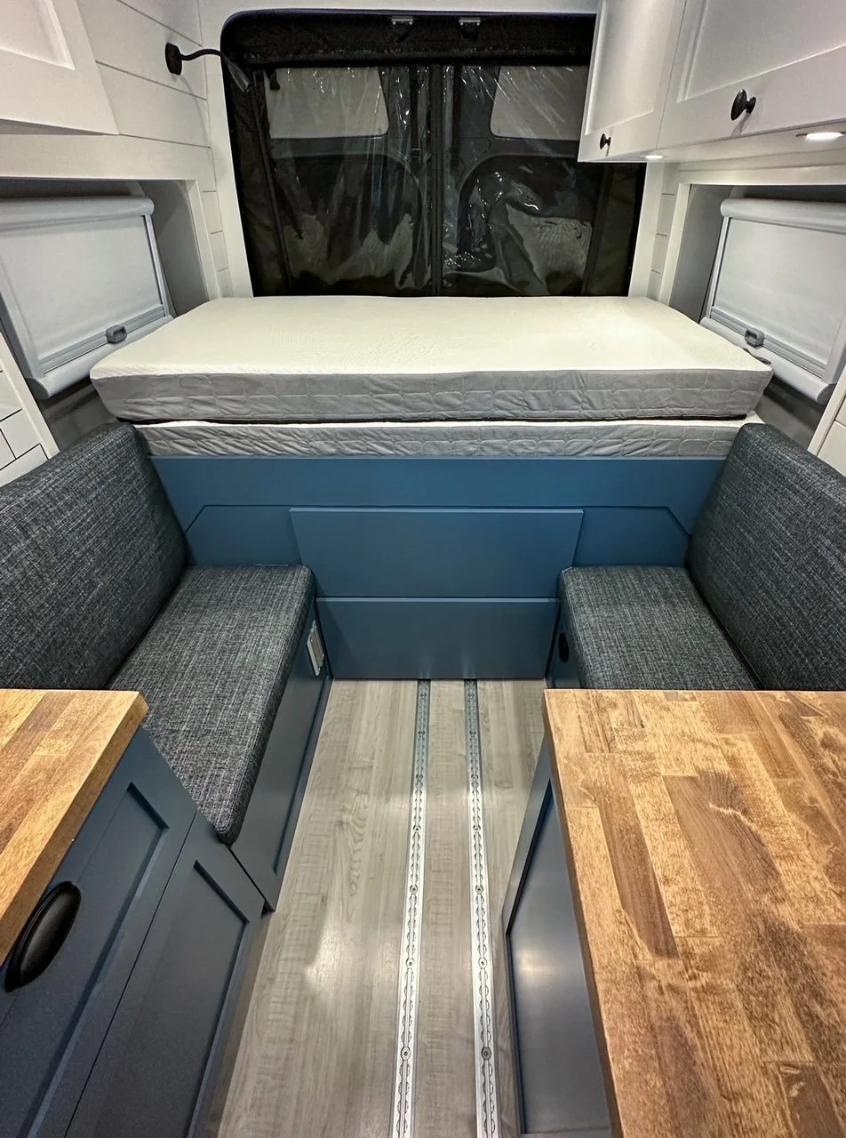 We started with a SmartFloor system to allow for safe passenger seating. The bed platform was designed to double in width at the press of a button (literally!). Two opposing benches make for a great eating nook and convert to an additional bed at night.