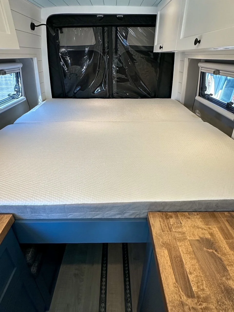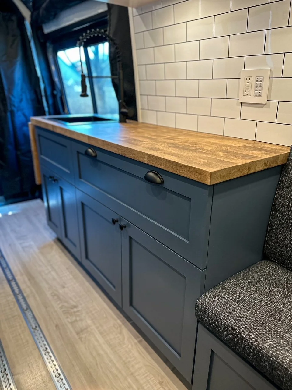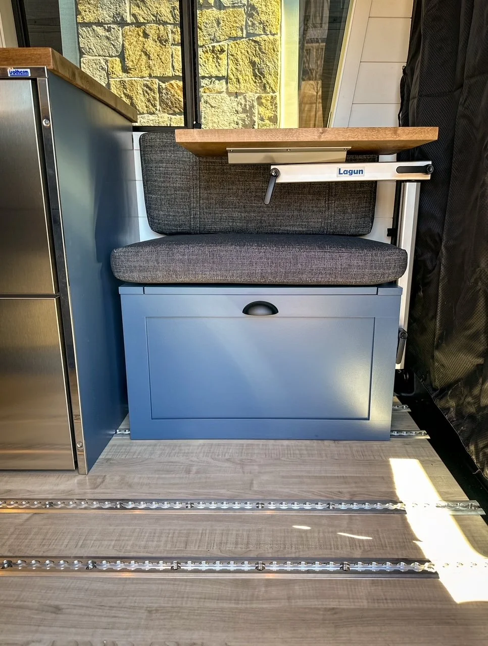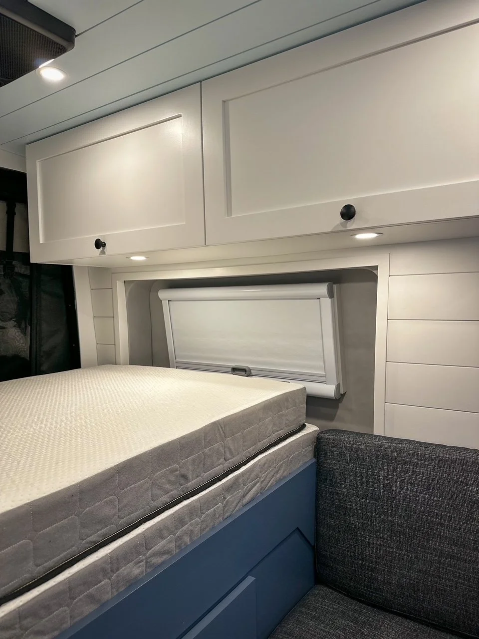 We started with a SmartFloor system to allow for safe passenger seating. The bed platform was designed to double in width at the press of a button (literally!). Two opposing benches make for a great eating nook and convert to an additional bed at night.