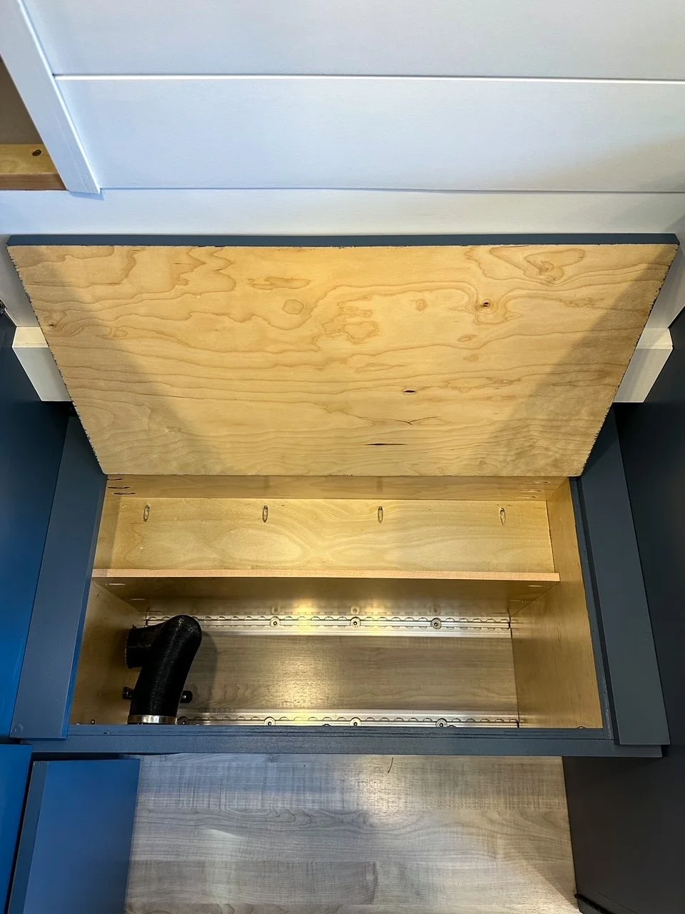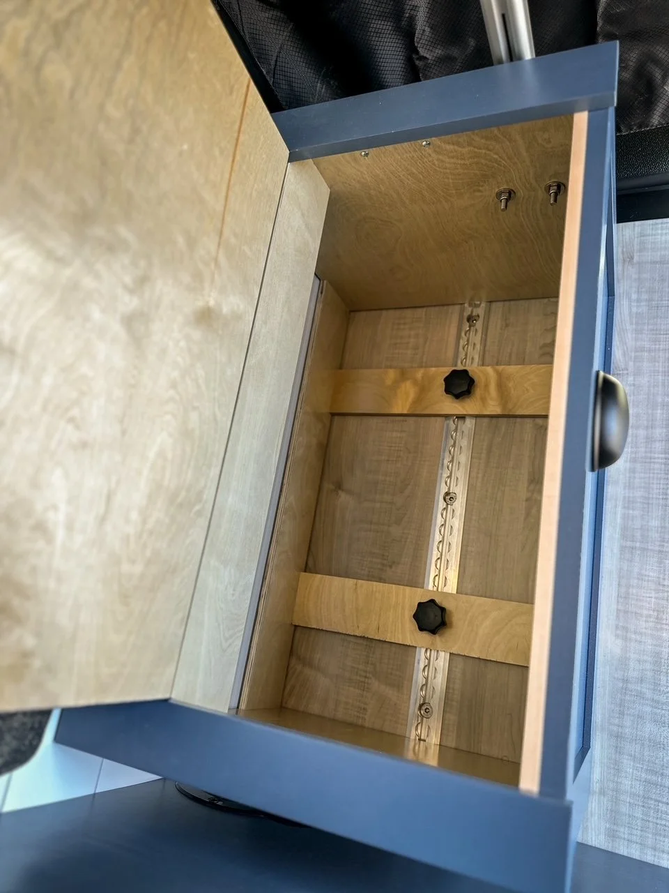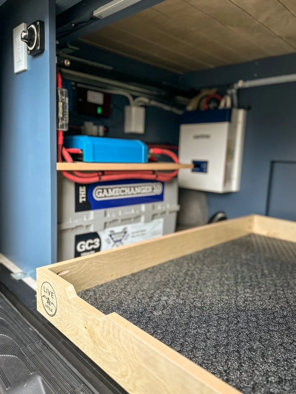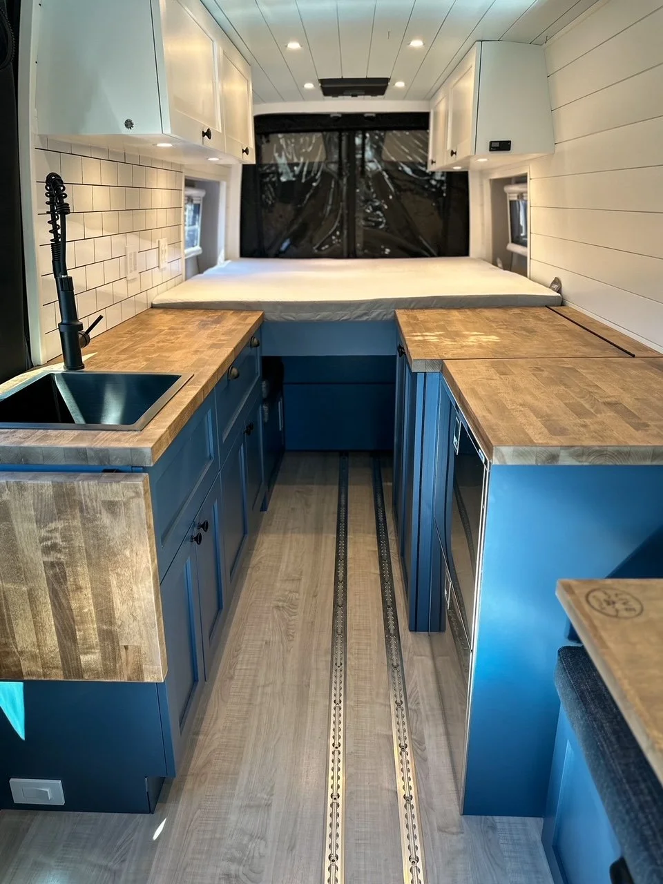 We started with a SmartFloor system to allow for safe passenger seating. The bed platform was designed to double in width at the press of a button (literally!). Two opposing benches make for a great eating nook and convert to an additional bed at night.