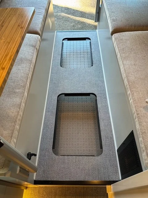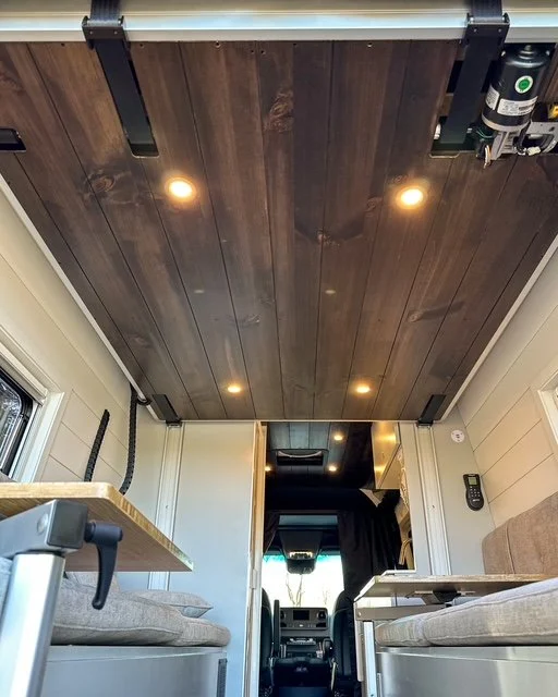 One of the standout features of this build is the motorized lift bed, which effortlessly raises to reveal a second sleeping area below—perfect for accommodating guests while on the road. Beneath it all, a clever underfloor storage compartment runs the length of the garage, sized specifically for cross-country skis and other long gear that usually doesn't fit well inside a van.