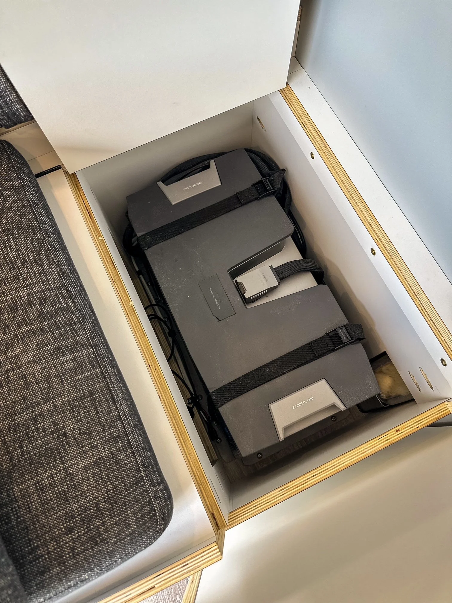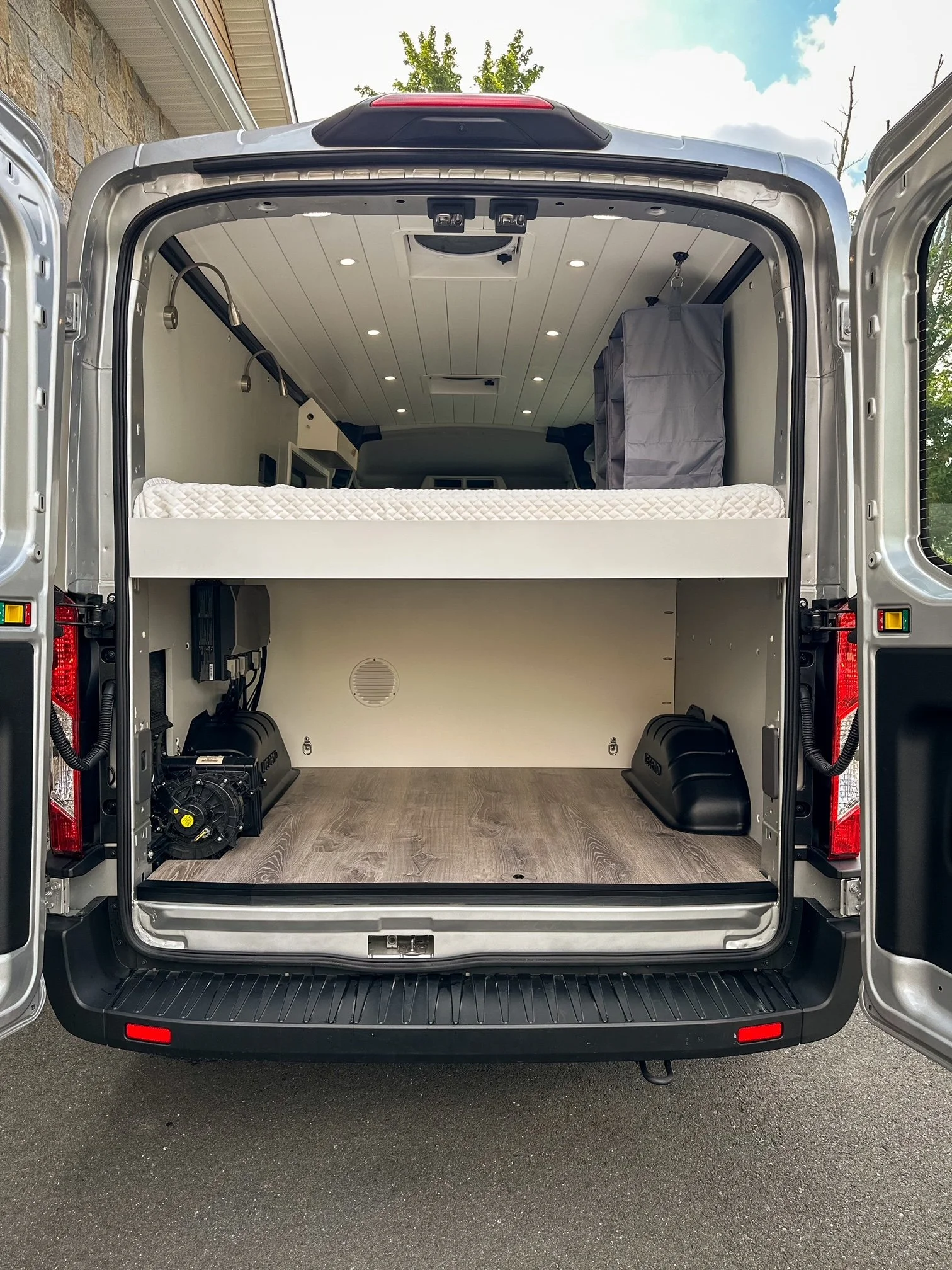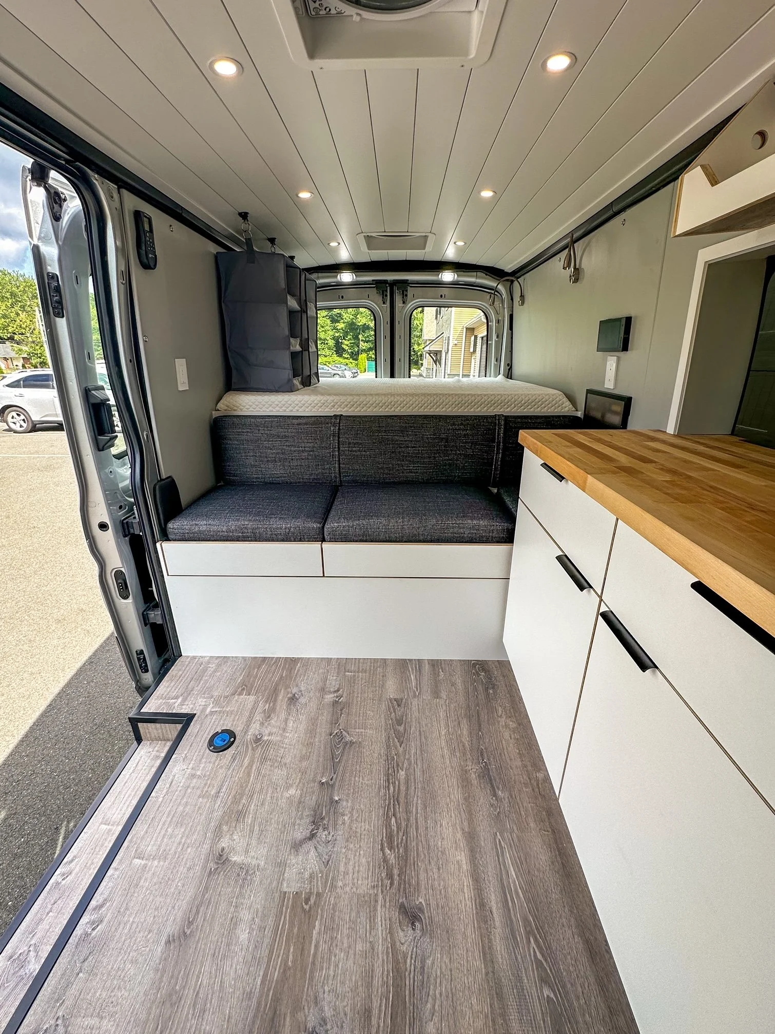 We built this van as a simple, low maintenance getaway vehicle. It has the essentials needed to hit the road and the ability to discreetly boondock wherever your heart desires. We incorporated an EcoFlow power kit with solar, alternator and shore power charging to power lights, refrigerator/freezer, composting toilet and microwave.