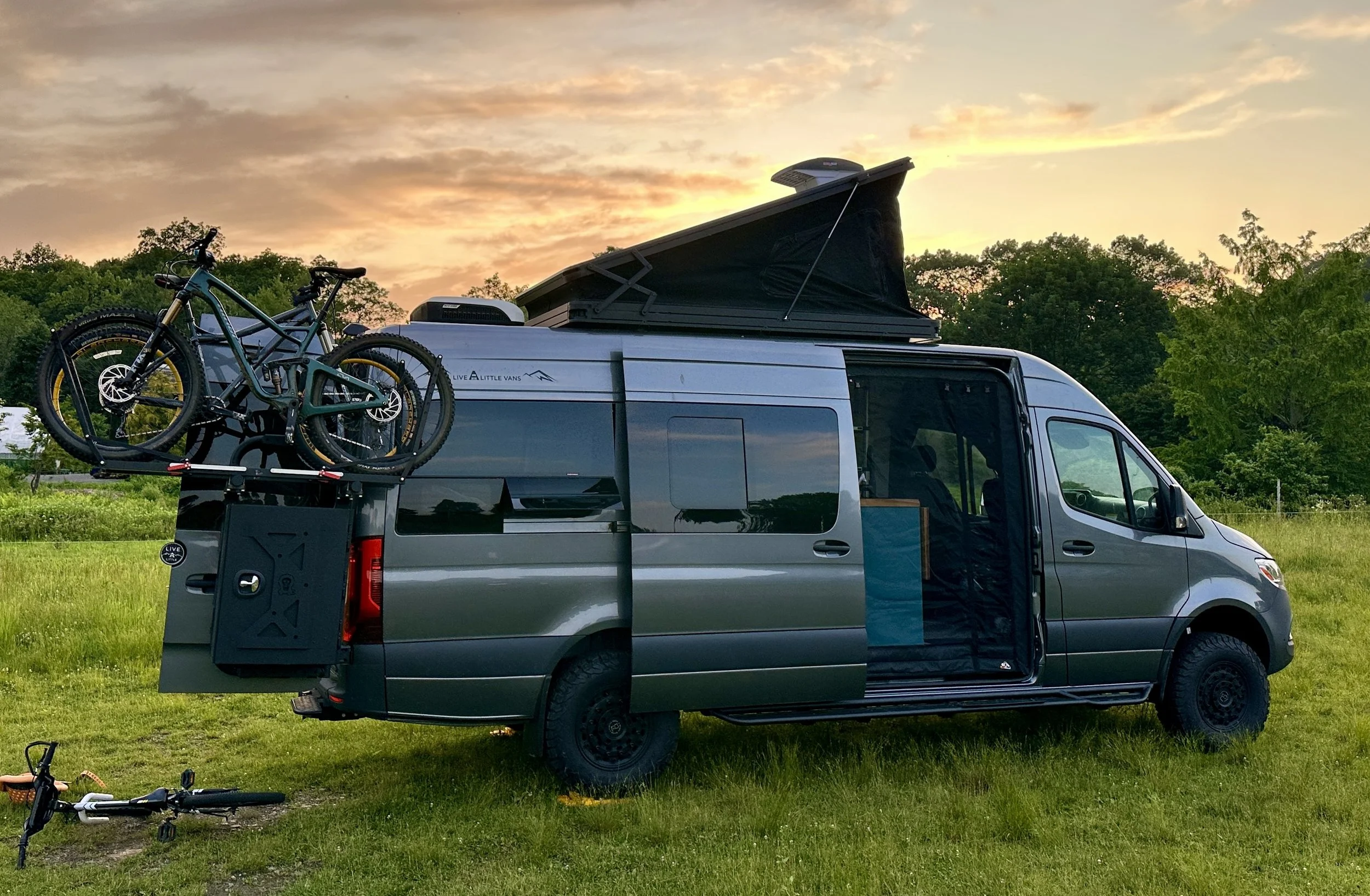Smart storage solutions are integrated throughout the build, ensuring everything from camping gear to bikes and travel essentials has its place. Every detail of this van was designed with family travel and adventure in mind. Hood has a dent from fallen tree branch (will provide photo ASAP) Please note PopRak was installed after some of the photos were taken.
