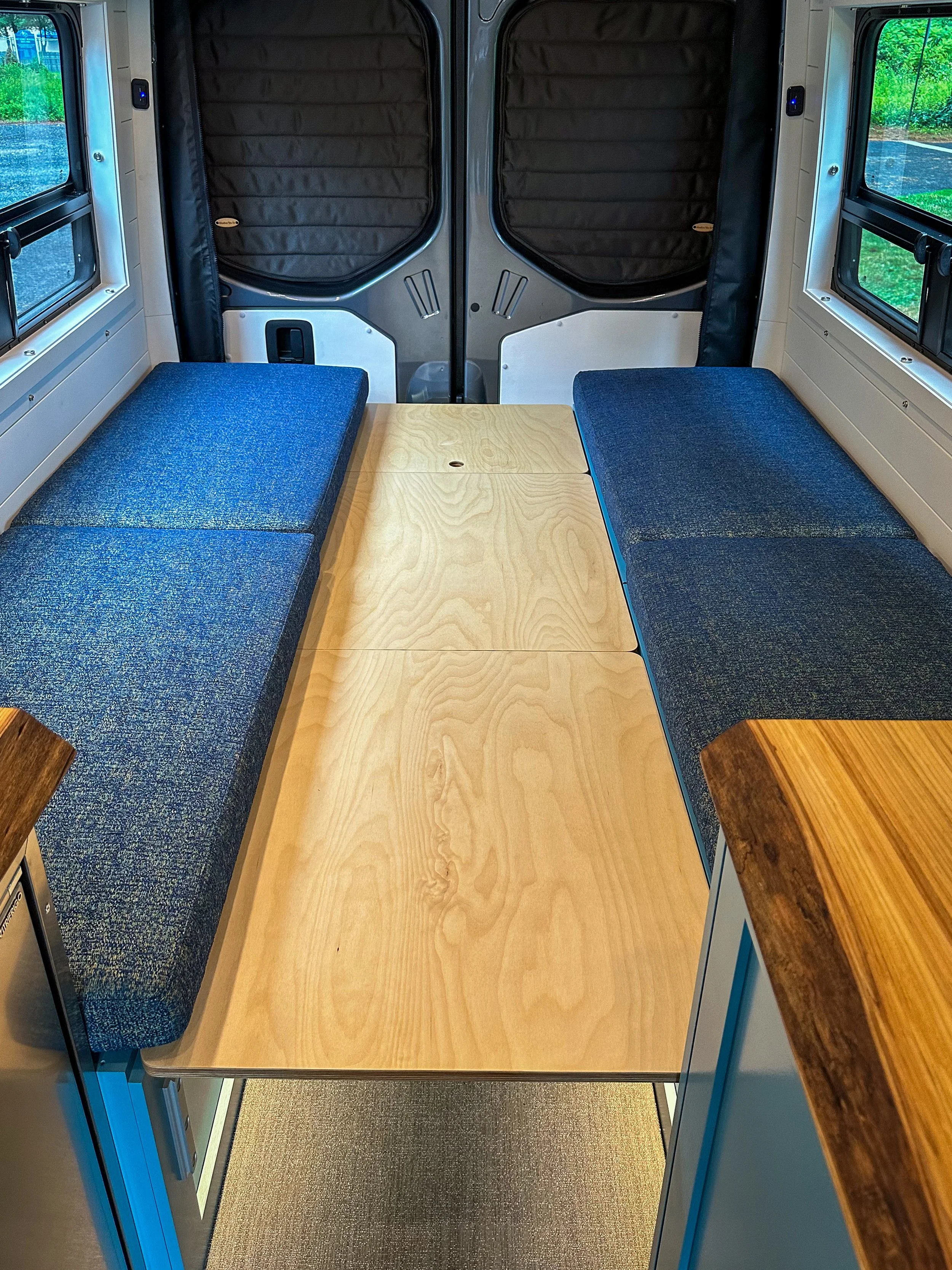 At the heart of the interior is a spacious rear dinette, creating a comfortable place to gather, enjoy meals, play games, or relax after a day outdoors. In the evening, the dinette quickly converts into a cozy bed. Additional sleeping space is provided by the PopRak rooftop sleeping system, which can be accessed directly from inside the van.