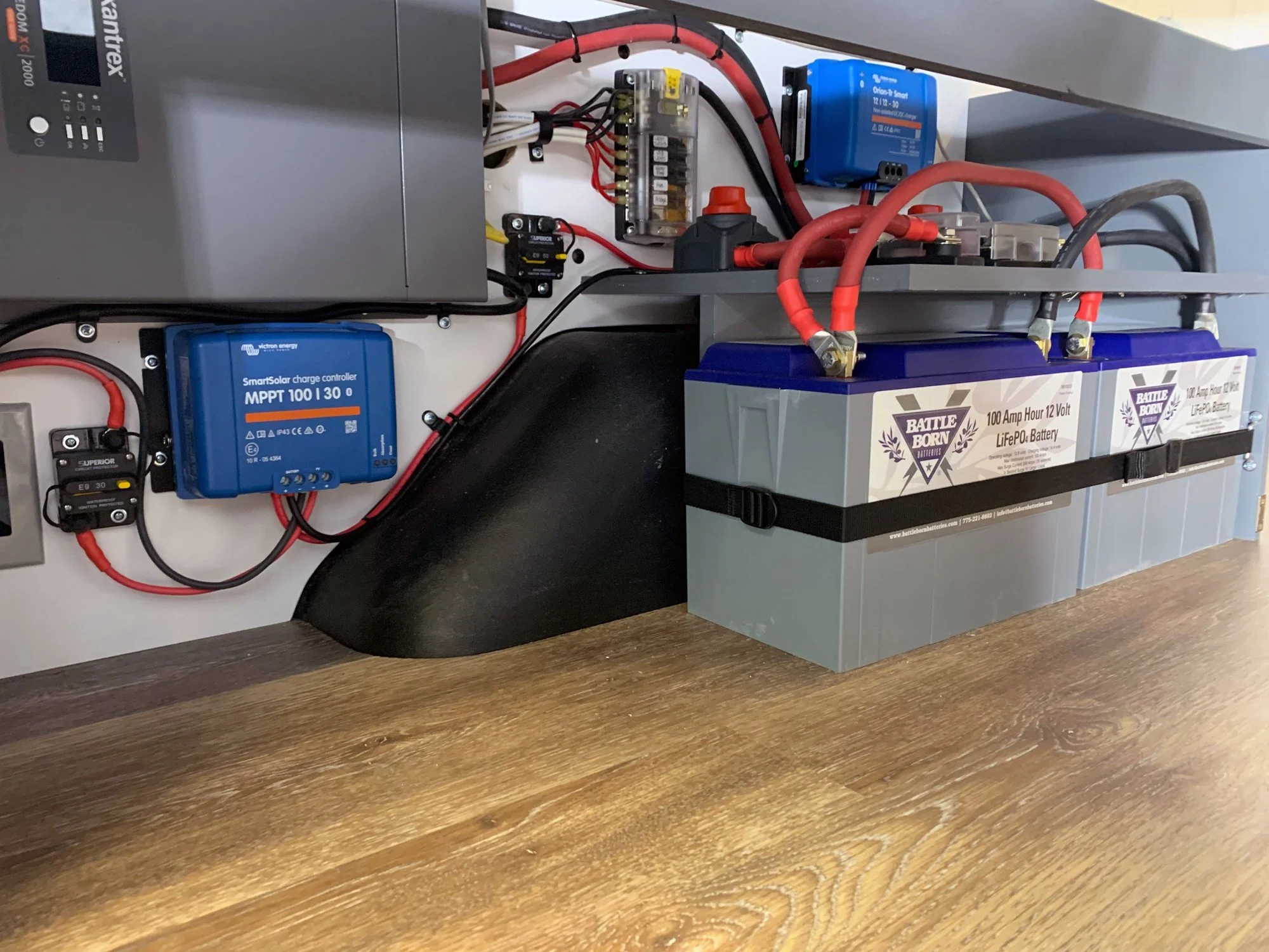 Power is handled by a dependable off-grid system: 200Ah Battle Born lithium battery, 400W Renogy solar, Victron MPPT solar controller, Victron DC-DC charger, Victron battery monitor, and a 2000W Xantrex inverter/charger with rear shore-power hookup. The interior also includes luxury vinyl plank flooring, dimmable LED lighting, and USB reading lamps.