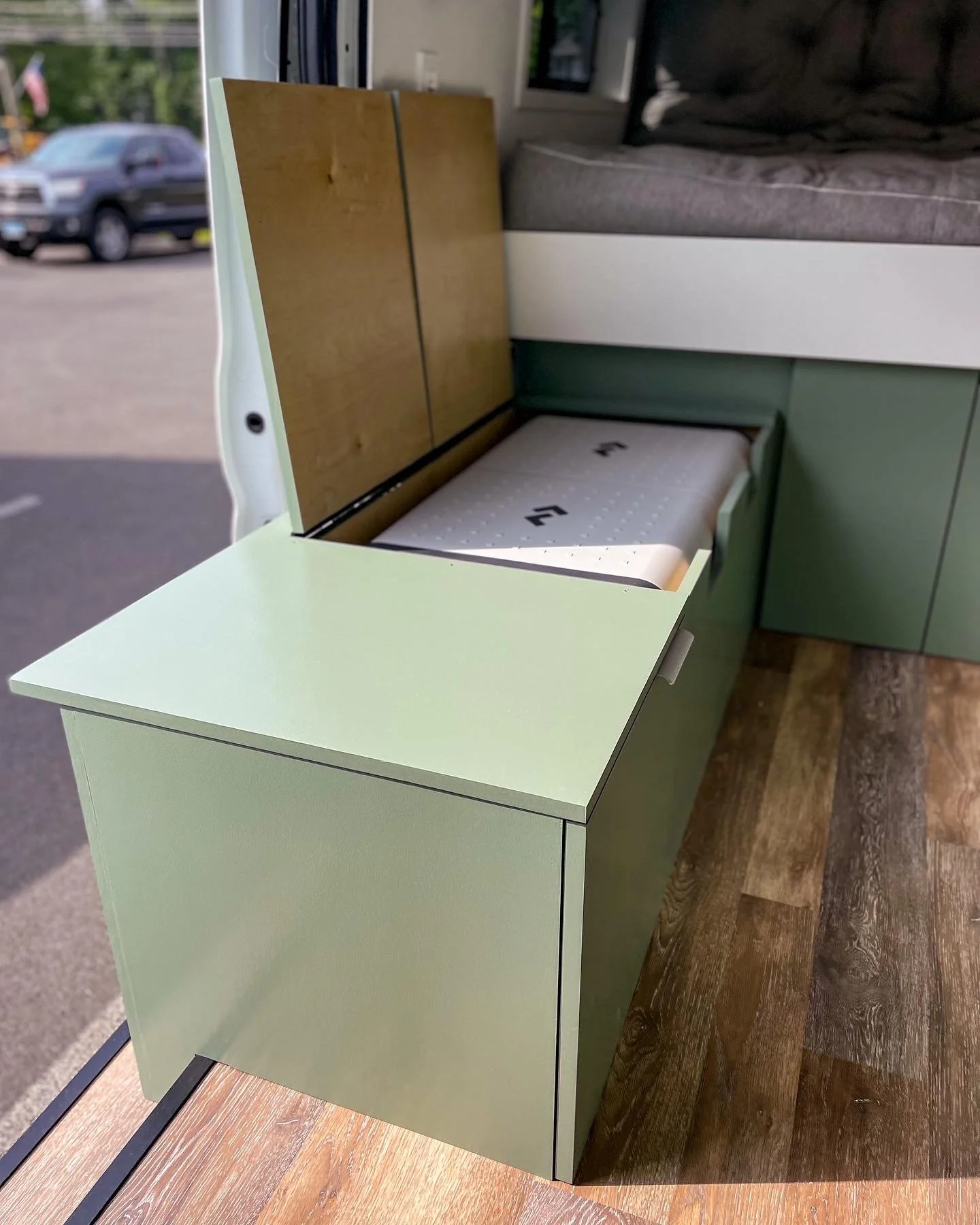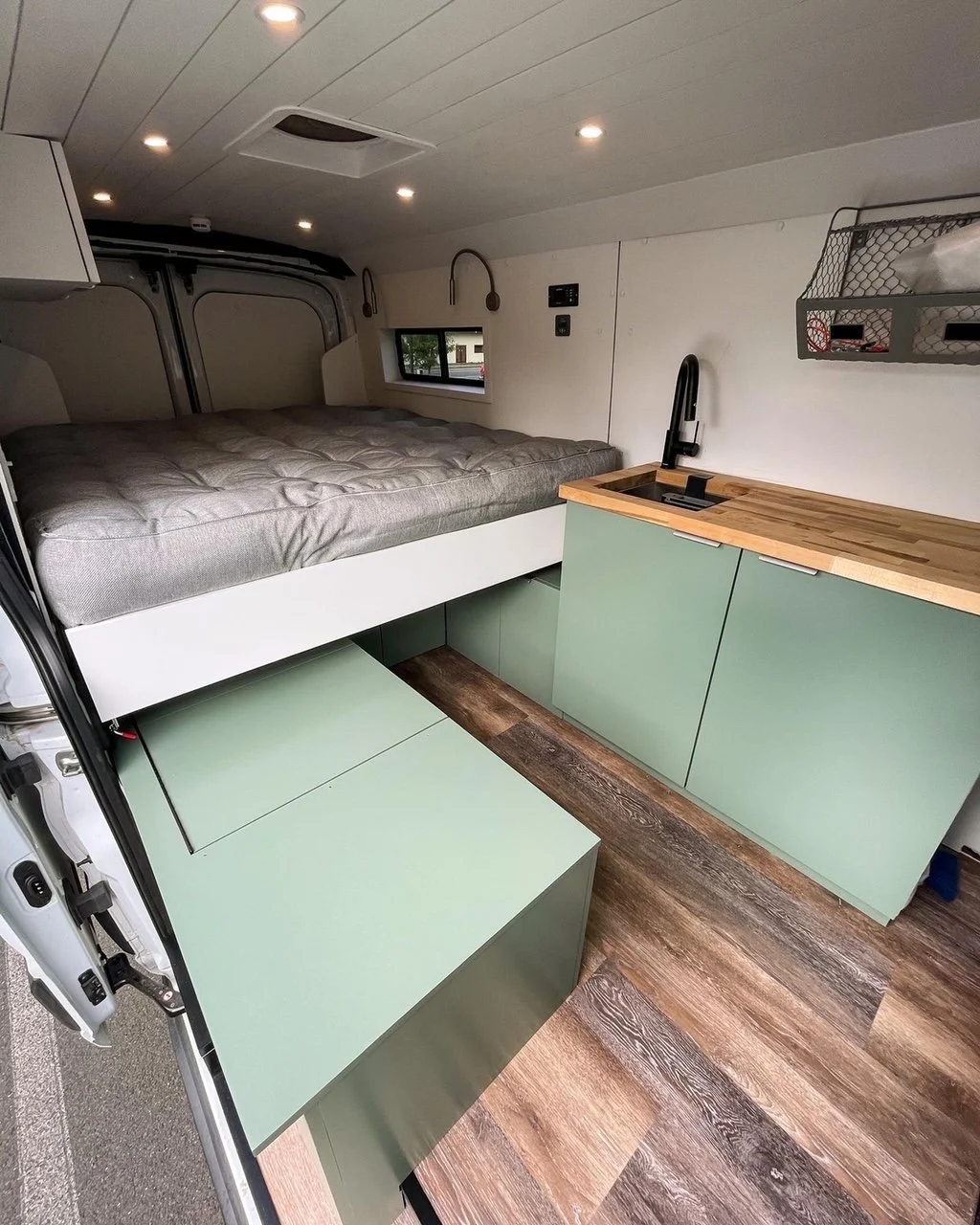 Cindy features a bright, comfortable interior with green-painted cabinetry and a birch butcher-block countertop, giving the space a warm, modern feel. The expanding bed platform with mattress (included), CRL bunk windows, T-vent slider window, and MaxxAir 7500K fan create a cozy and well-ventilated living space.